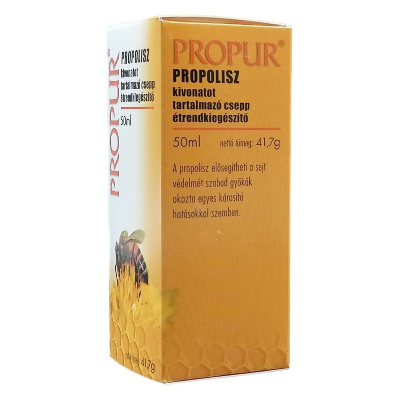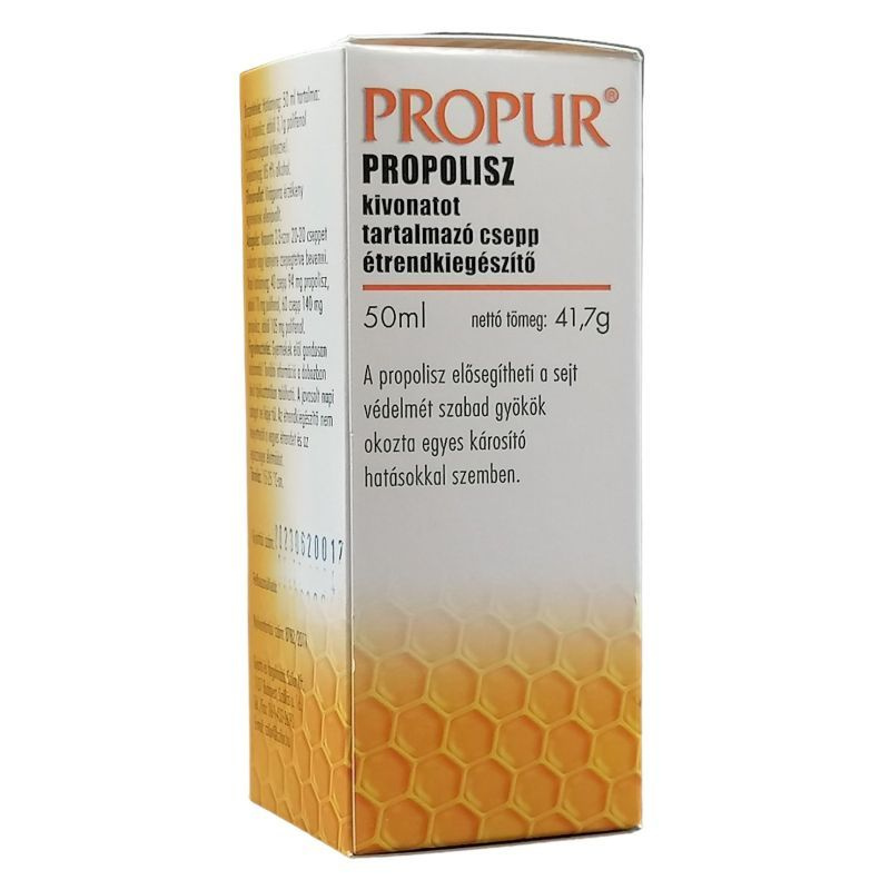 Mi a Propur csepp hatóanyaga? 50 ml készítmény tartalmaz 4.3 g propolisz kivonatot (Propolis extractum)(szárazanyagban kifejezve). Mit tartalmaz még a készítmény? Segédanyagként a készítmény tartalmaz még 85 tf%-os alkoholt, mely adagonként 0.57 g alkoholnak felel meg. Mikor ajánlott a készítmény alkalmazása? A Propur csepp alkalmazása ajánlható: általános erősítésre, étvágyjavításra, enyhe fertőzések miatti szájüregi és felső légúti megbetegedések (pl. torokgyulladás) megelőzésére illetve enyhítésére önállóan vagy a gyógyszeres terápia kiegészítéseként, gyomor-, bél- és húgyivar-rendszerben fellépő gyulladások mérséklésére.