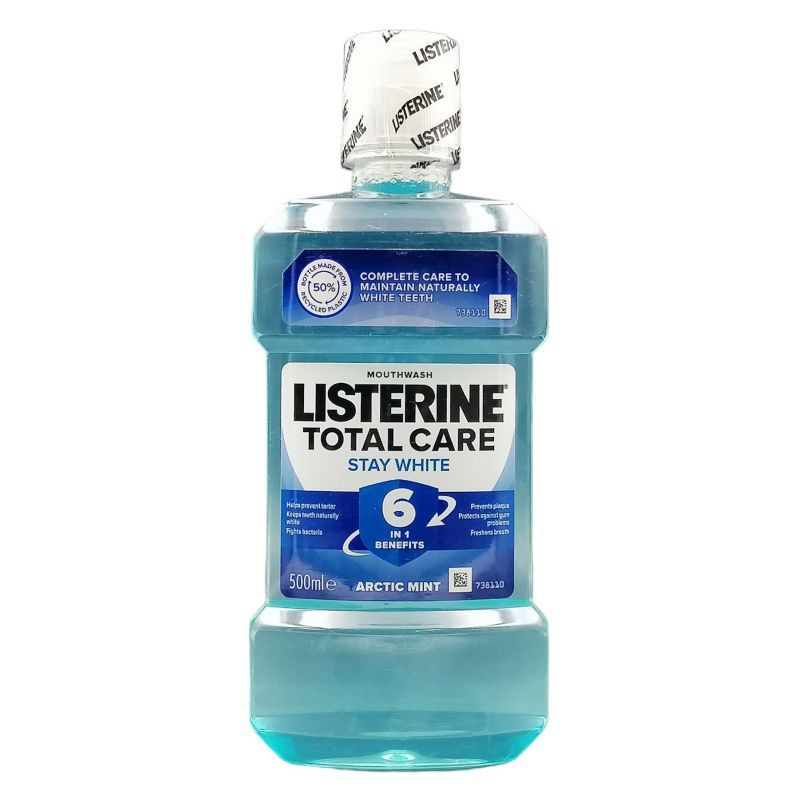 A Listerine Stay White antibakteriális szájvíz illóolaj összetevőket tartalmaz: eukaliptol, timol, mentol és metil-szalicilát.