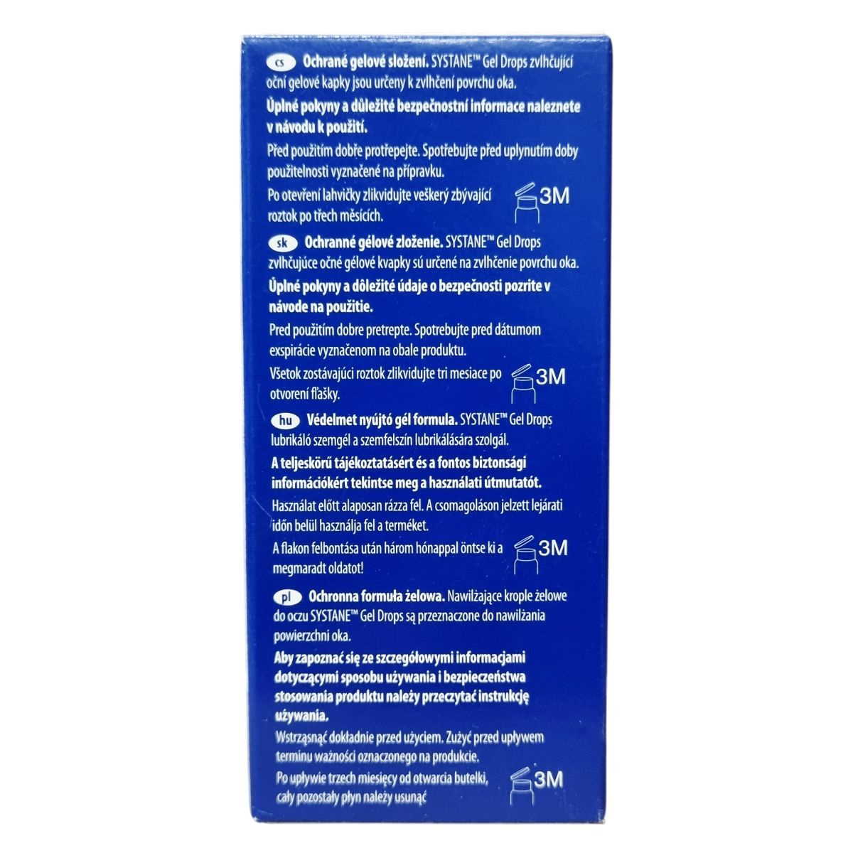 A Systane™ GEL DROPS egy védő és hidratáló géloldat, mely segít megőrizni a szem felszínének nedvességtartalmát és enyhíti a szárazságérzetet. A termék sterilen előállított, és több hatékony összetevőt, például polietilén-glikolt, propilénglikolt, guar-hidroxi-propilt, szorbitolt, valamint POLYQUAD™ tartósítószert tartalmaz. A készítmény bórsavat is tartalmaz, amely hozzájárul a szem kényelmének fenntartásához. Ez a gélkészítmény alkalmas mindennapos, napi vagy éjszakai használatra. Minden használat előtt alaposan fel kell rázni a flakont, és a termék steril tulajdonságainak megőrzése érdekében a felbontást követő három hónapban kell felhasználni. A termék biztonságosságáról és alkalmazásáról további információkat a használati útmutató tartalmaz.