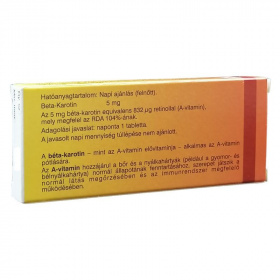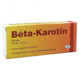 Mi a Béta-Karotin tabletta hatóanyaga? Hatóanyag 10mg Betacarotenum (Bétakarotin)/tabletta. Mit tartalmaz még a készítmény? A készítmény a következő segédanyagokat tartalmazza szacharóz, zselatin, kukoricakeményítő, mannit, makrogol 4000, povidon, nátrium-aszkorbát, tokoferol-koncentratum, aszkorbil-palmitát, magnézium-sztearát, trikalcium-foszfát, víz. A várandósság és szoptatás ideje alatt megnő a szervezet A-vitamin iránti igénye, ezért ezen élethelyzetekben alkalmazható a készítmény. Várandósság alatt 30 mg-ot meghaladó mennyiség szedése nem ajánlott. Adagolási javaslat: naponta 1 tabletta.