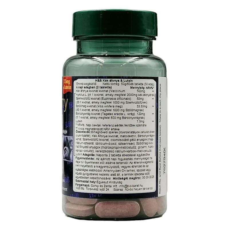 Összetevők: tömegnövelő szerek (mikrokristályos cellulóz , dikalcium-foszfát), Kék Áfonya kivonat, maltodextrin, Bársonyvirág kivonat, Szemvidítófű kivonat, csomósodást gátló anyagok (magnézium-sztearát, szilícium-dioxid, sztearinsav), Szőlőmag kivonat, fényező anyagok (hidroxipropil-metilcellulóz, glicerin, hidroxipropilcellulóz), keresztkötésű nátrium-karboxi-metil-cellulóz, Lutein