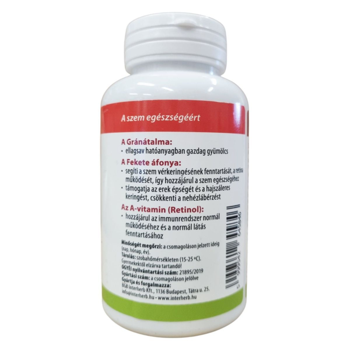 Az INTERHERB Gránátalma Fekete áfonya +Retinol étrend-kiegészítő tabletta a szem egészségének támogatására készült. A gránátalma ellagsavban gazdag, míg a fekete áfonya segítheti a szem vérkeringésének fenntartását és a retina működését. Az A-vitamin hozzájárulhat a normál látás fenntartásához és az immunrendszer normál működéséhez. A termék minőségét a csomagoláson jelzett ideig őrzi meg, és szobahőmérsékleten tárolandó. A termék forgalmazója az Interherb Kft., amelynek székhelye Budapest, Tátra u. 25.