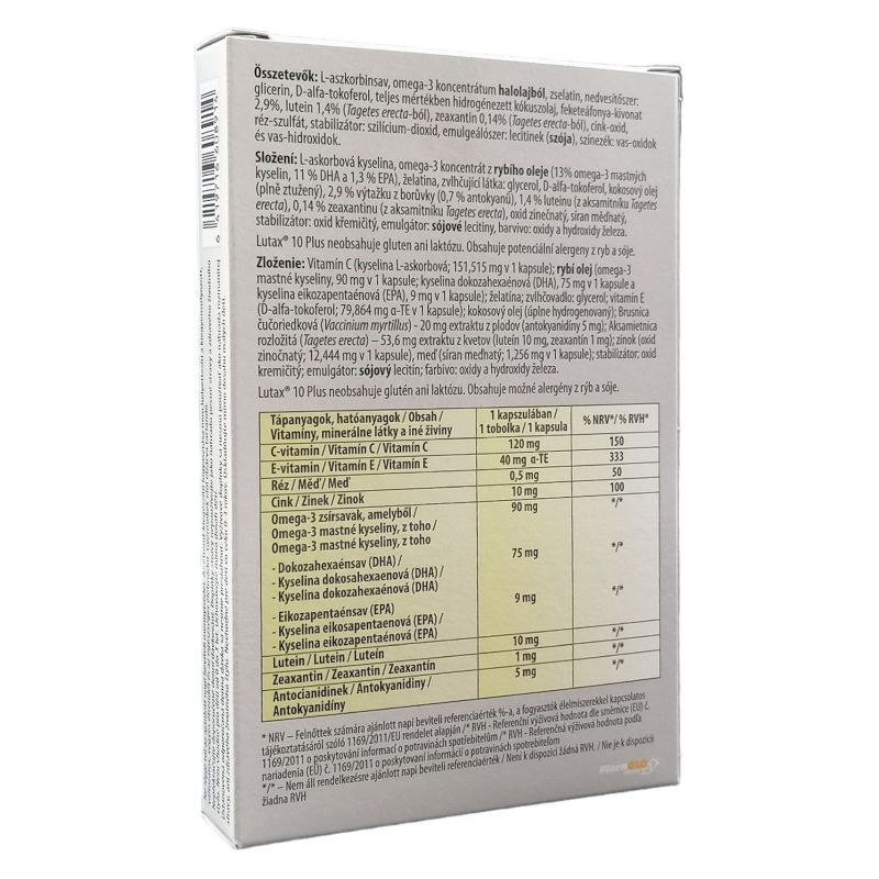 Amennyiben a fenti összetevőkből étkezéssel nem tudunk megfelelő mennyiséget a szervezetünkbe juttatni, akkor a hiányzó mennyiséget étrend-kiegészítőkkel pótolhatjuk. Ezek közül a Lutax AMD Plus az egyik legteljesebb összetételű étrend-kiegészítő, amely tartalmazza a legfontosabbnak tartott összetevőket. Lutein, zeaxantin, C- és E-vitaminok, valamint cink mellett Omega-3 zsírsavakat is tartalmaz. Emellett fekete áfonya kivonat is található benne, amely szintén erősen antioxidáns hatású.