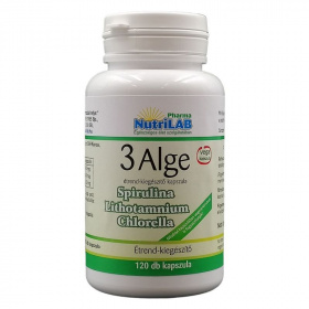 Normális táplálkozás mellett a szervezet kevesebb energiát vesz fel. Megemésztetlen keményítő halad át a beleken és elősegíti a belek aktivitását. Mi vonatkozik a magas kalcium tartalmú Alga Lithothamniumra? Kalcium fenntartja a szív egészségét. Chlorella alga miben segít? Fokozza az életerőt, energiát. Antioxidáns. Egészséges májért. Hatóanyagai: Spirulina alga por: 160 mg (kék alga), Chlorella alga por: 160 mg (zöld alga), Lithothamnium alga por: 80 mg (vörös alga). Összetevők: Spirulina alga por, Chlorella alga por, Lithotamnium alga por, maltodextrin (térfogatnövelő szer), mikrokristályos cellulóz (csomósodást gátló), szilícium-dioxid (csomósodást gátló), növényi sztearinsav (csomósodást gátló), növényi magnézium sztearát (térfogatnövelő szer). Ajánlott napi mennyiség: naponta 4 tabletta fogyasztása ajánlott. Energiatartalom: 2,8 kJ/ 0,8 kcal, Fehérje: 3,2 mg, Szénhidrát: 144,8 mg, Zsír: 13,2 mg.