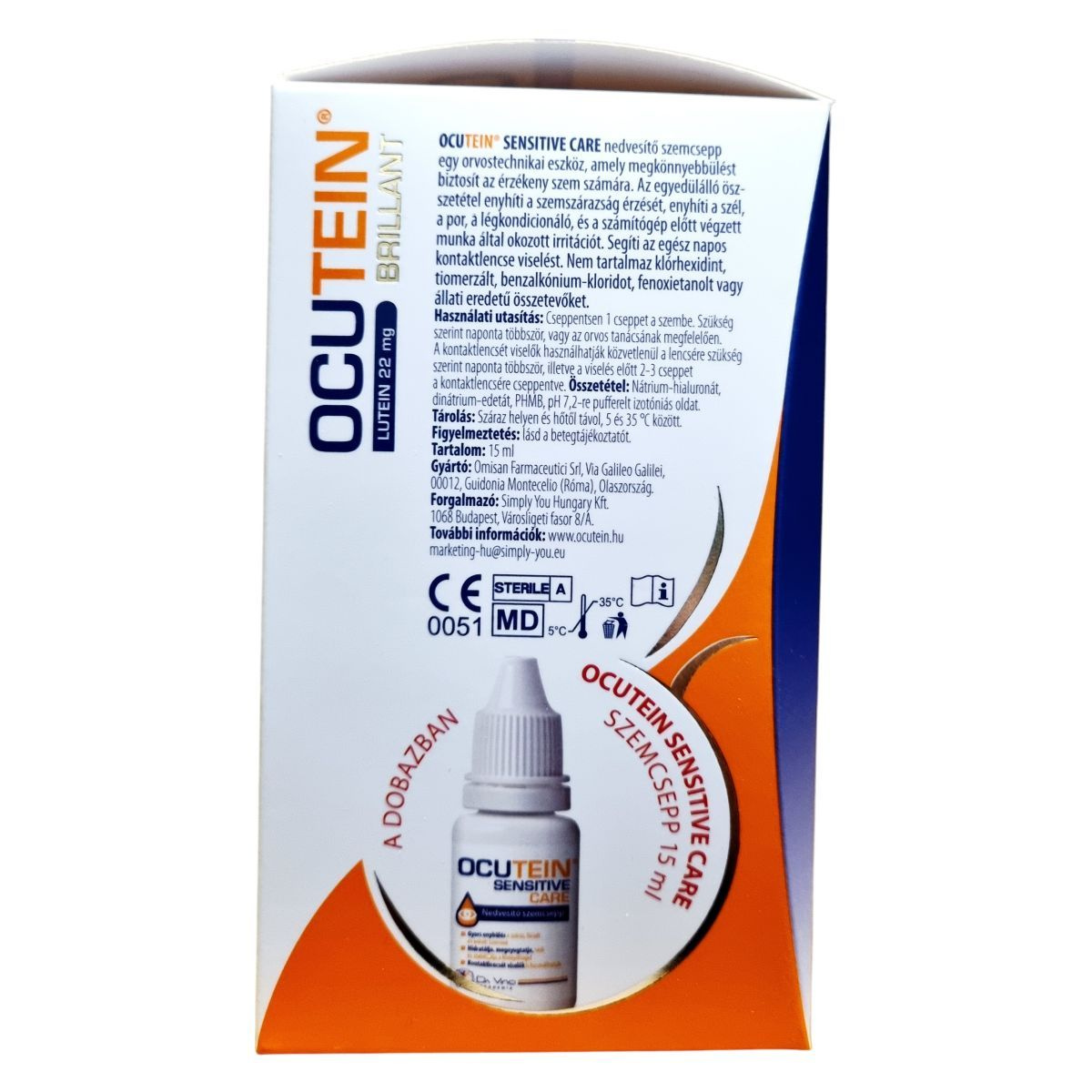 Az OCUTEIN® BRILLANT Lutein 22 mg egy étrend-kiegészítő, amely a szem egészségének támogatására szolgál. A termék három fő komplexet tartalmaz: a Karotinoid Komplexet (lutein, zeaxantin, A-vitamin), amely a normál látás megőrzésében játszik szerepet; a Mikroelem Komplexet (cink, réz, szelén), amely hozzájárul a sejtek oxidatív stressz elleni védelméhez; és az FFK Komplexet (folsav, foszfatidil-kolin), amely a normál homocisztein anyagcserében és a sejtmembránok építésében vesz részt. A termék 120 kapszulát tartalmaz, amely 4 havi adagot jelent. Az OCUTEIN SENSITIVE CARE szemcsepp is megtalálható a csomagban, amely enyhíti a szemszárazságot és az irritációt.