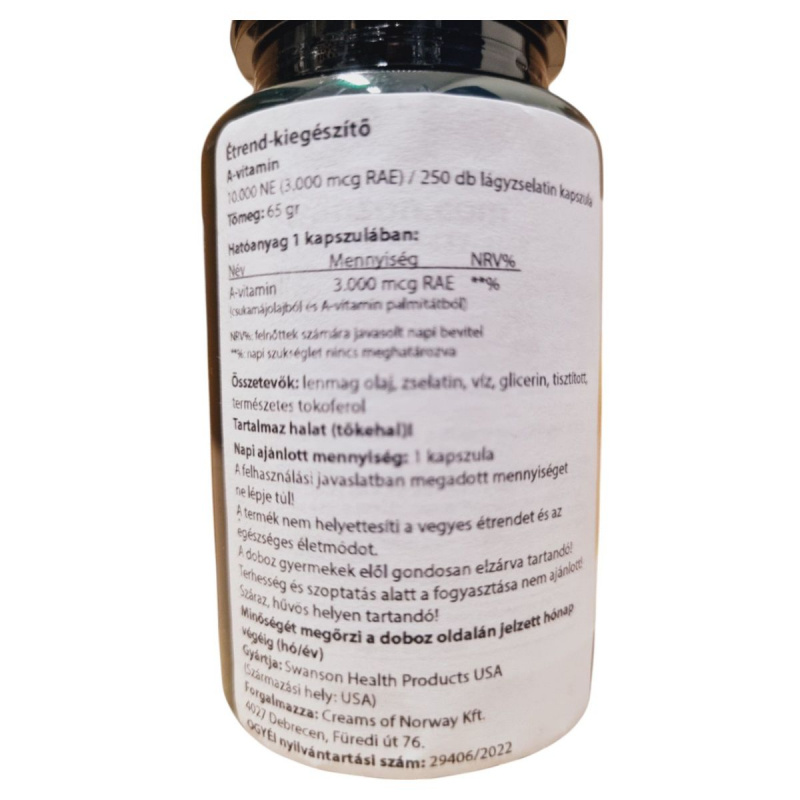 A Swanson Health Products A-vitamin étrend-kiegészítője 250 db lágyzselatin kapszulát tartalmaz, melyek mindegyike 3.000 mcg RAE A-vitamint biztosít. Az A-vitamin csukamájolajból és A-vitamin palmitátból származik, és hozzájárulhat a normál látás fenntartásához, valamint támogathatja az immunrendszer egészséges működését. A termék lenmag olajat, zselatint, vizet, glicerint és természetes tokoferolt tartalmaz. Fontos megjegyezni, hogy a termék halat (tőkehal) tartalmaz, ezért halallergiások számára nem ajánlott. A kapszulák tárolása száraz, hűvös helyen javasolt, és a termék fogyasztása terhesség és szoptatás alatt nem ajánlott. A termék forgalmazója a Creams of Norway Kft., Debrecen.