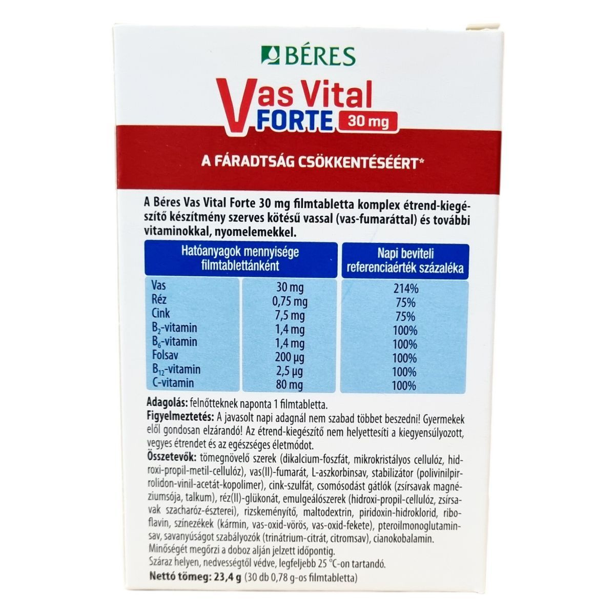 A Béres Vas Vital Forte 30 mg filmtabletta komplex étrend-kiegészítő készítmény, amely szerves kötésű vassal (vas-fumaráttal), vitaminokkal és nyomelemekkel készül. A benne lévő vas, folsav, C-vitamin, B2-, B6- és B12-vitamin hozzájárulhat a fáradtság és kifáradás csökkentéséhez, a normál szellemi működés fenntartásához, valamint a normál pszichológiai funkciók és az idegrendszer működéséhez. A vas részt vesz a normál vörösvérsejt- és hemoglobin-képződésben, míg a folsav és a B-vitaminok a vérképződés fenntartásához járulhatnak hozzá. A C-vitamin fokozhatja a vas felszívódását, a réz pedig részt vesz a normál vasszállításban. Az alkalmazása javasolt elégtelen vasbevitel esetén, például szigorú diéta vagy kiegyensúlyozatlan táplálkozás esetén, valamint megnövekedett vasszükséglet esetén, mint várandósság, szoptatás, aktívkorú nők, erős menstruáció vagy fokozott fizikai és szellemi terhelés esetén.