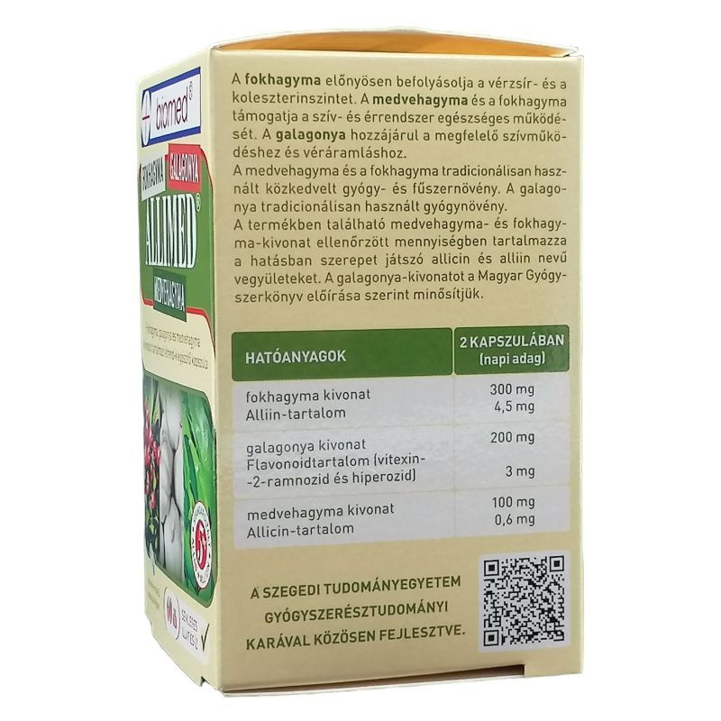 Fokhagyma-, galagonya- és medvehagymakivonatot tartalmazó étrend-kiegészítő kapszula, növényi eredetű kapszulahéjban, semleges illattal és ízzel.