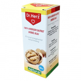 A Dr.Herz® 100% hidegen sajtolt dióbél olaj természetes alapanyagból, kiváló minőségű, hígítatlan olajként készült, mely a hidegen sajtolásnak köszönhetően megőrzi természetes összetevőit. A termék naponta egy teáskanál adagban fogyasztandó, étkezés közben vagy salátákhoz keverve, elősegítve az egészséges étrend kialakítását. A készítmény kizárólag eredeti dióbél olajat tartalmaz, és tárolását hűvös, fénytől védett helyen javasolt biztosítani. Az étrend-kiegészítő nem helyettesíti a változatos, kiegyensúlyozott étrendet és nem alkalmas gyermekek, valamint terhes és szoptató anyák számára.