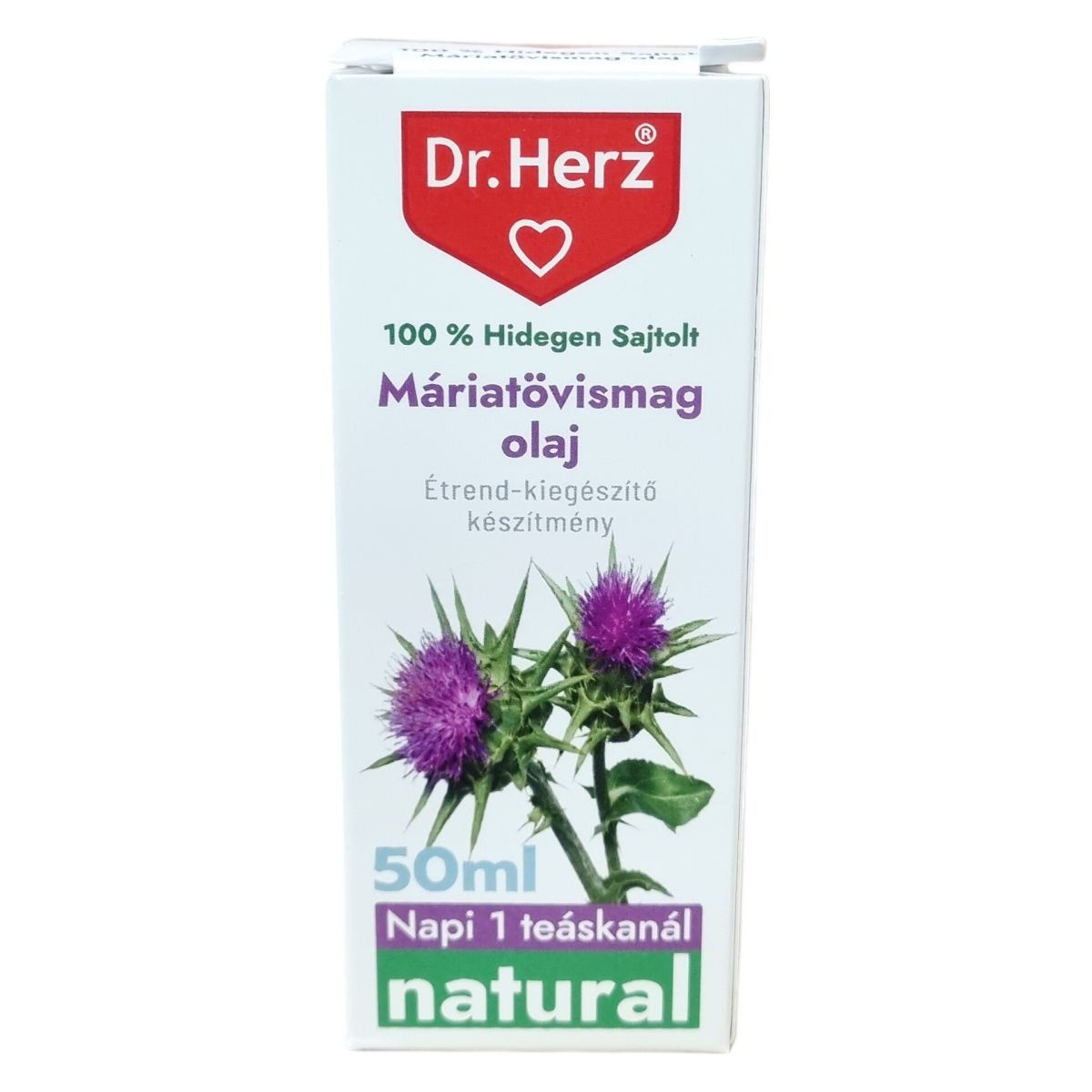 A Dr.Herz® 100 % hidegen sajtolt máriatövismag olaj természetes összetevőkből készül, és hidegen sajtolt eljárással állítják elő, hogy megőrizzék a kiváló minőségét. Termékeik között megtalálhatók vitaminok, étrend-kiegészítők, belsőleges oldatos cseppek, hidegen sajtolt olajok, 100% természetes illóolajok és gyógynövényes krémek. Különféle felhasználási területekre kínálnak megoldásokat, például immunerősítésre, fogyókúrára, méregtelenítésre, emésztés és anyagcsere támogatására, szív- és érrendszeri egészségre, csont-, porc- és ízületvédőként, valamint férfi és női egészség, illetve haj, bőr és köröm ápolására. A termék a megszokott napi étrend kiegészítésére alkalmas, és természetes összetételének köszönhetően támogatni tudja az egészséges életmódot.