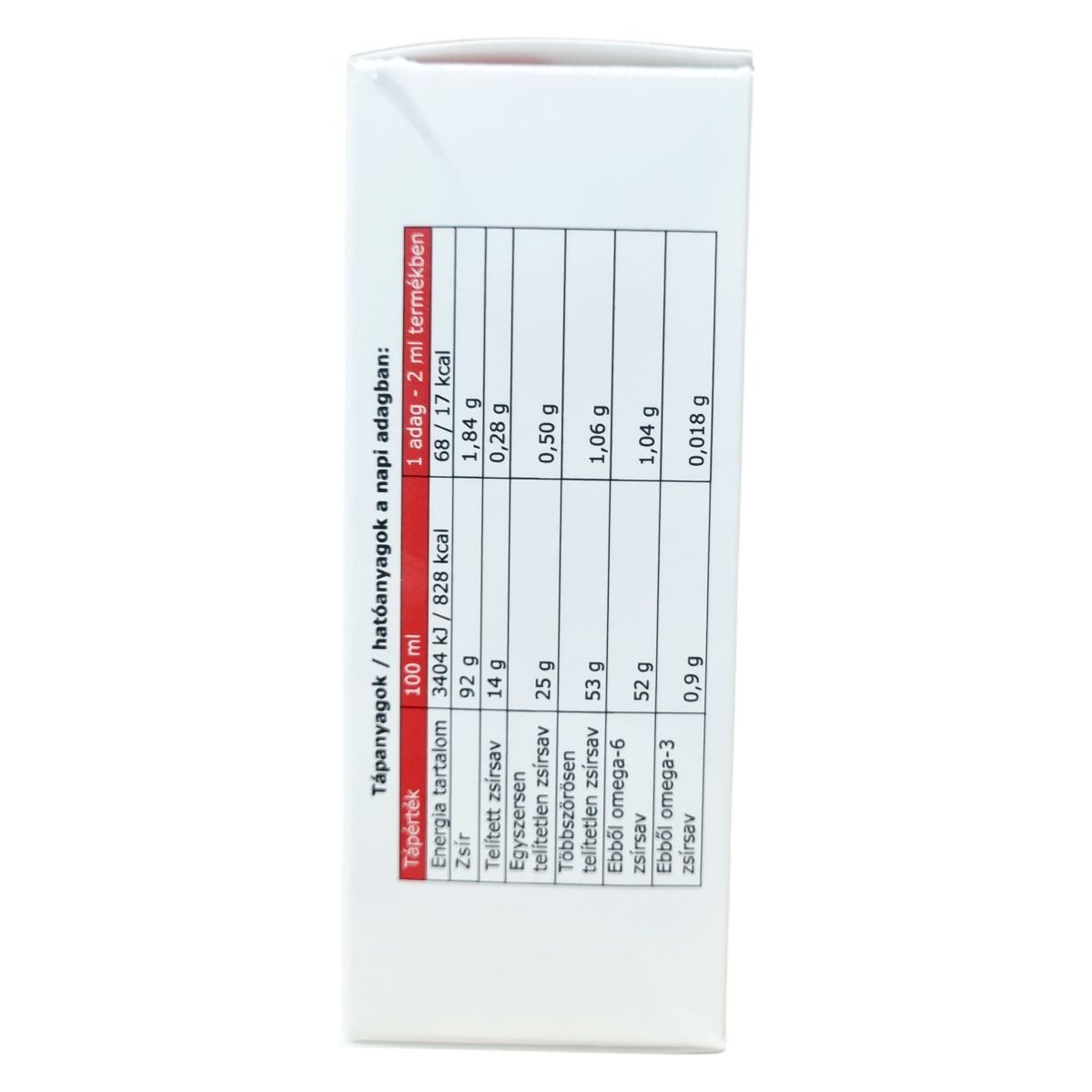 Zsír: 92 g, ebből telített zsírsav: 14 g, egyszeresen telítetlen zsírsav: 25 g, többszörösen telítetlen zsírsav: 53 g