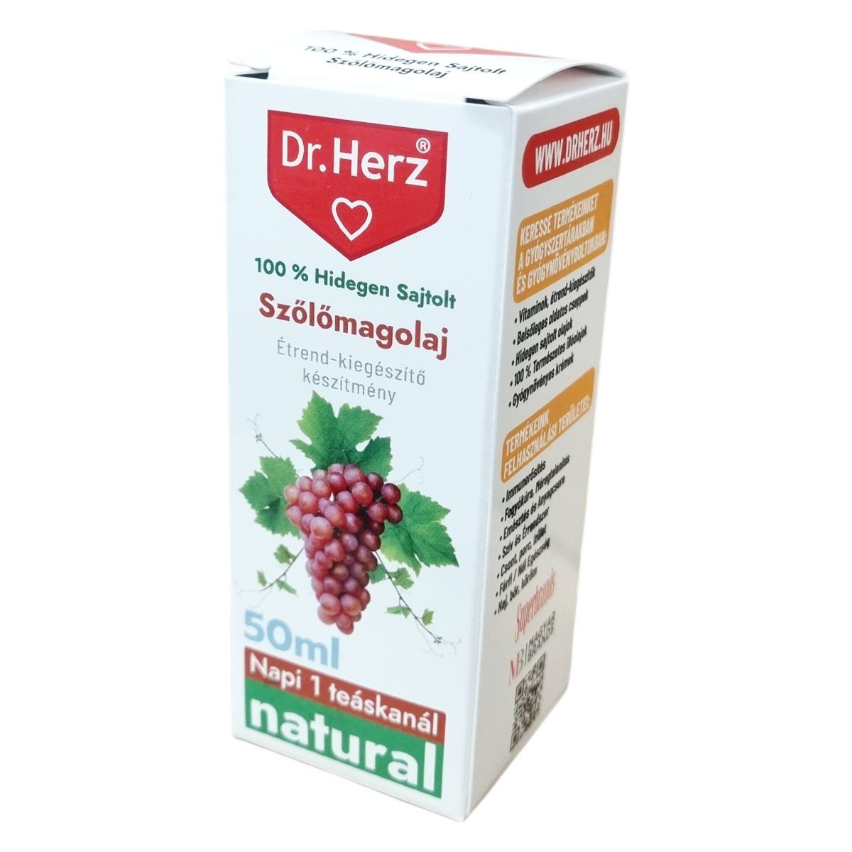 A Dr.Herz 100% hidegen sajtolt szőlőmagolaj készítmény természetes megoldásként támogatja az immunerősítést, fogyókúrát, méregtelenítést, az emésztést és anyagcserét, továbbá a szív és érrendszer, csontok, porcok, ízületek, valamint a haj, bőr és köröm egészségét. Termékeink megtalálhatók gyógyszertárakban és gyógynövényboltokban, széles választékban, többek között vitaminok, étrend-kiegészítők, belsőleges oldatos cseppek, hidegen sajtolt olajok, természetes illóolajok és gyógynövényes krémek formájában.