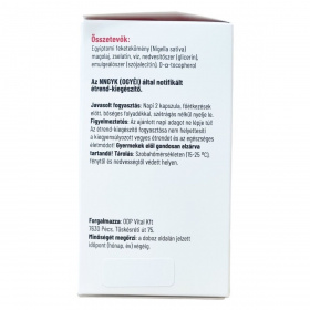 A Dr.Herz Feketekömény olaj + E-vitamin kapszula egy természetes étrend-kiegészítő, amely Egyiptomi feketeköménymag olajat (Nigella sativa) és E-vitamint tartalmaz. A terméket napi két kapszula fogyasztására javasolják főétkezések előtt, bőséges folyadékkal, szétrágás nélkül. A termék fő hatóanyagai a feketeköményolaj és az E-vitamin, amelyeket a szervezet általános támogatására használhatnak. Kizárólag természetes összetevőkből készül, és gondosan előállított kapszulában kerül forgalomba. A termék csak gyógyszertárakban és gyógynövényboltokban érhető el, ahol a Dr.Herz további vitaminokat, étrend-kiegészítőket, illóolajokat és gyógynövényes krémeket is kínál különféle egészségügyi területekre, mint az immunerősítés, anyagcsere, szív- és érrendszer, valamint haj, bőr és köröm ápolása. A termék tárolása szobahőmérsékleten, fénytől és nedvességtől védett helyen ajánlott. Az ajánlott napi adagot nem szabad túllépni, és a termék nem helyettesíti a kiegyensúlyozott étrendet és az egészséges életmódot.