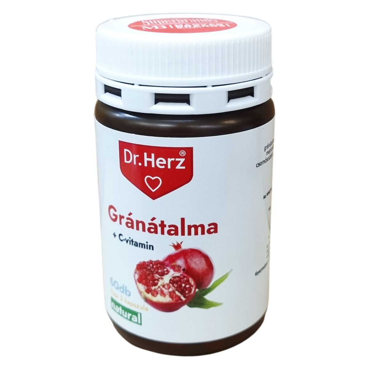 A Dr.Herz® Gránátalma + C-vitamin kapszula természetes alapanyagokból, gránátalma kivonatból és C-vitaminból készül. A C-vitamin hozzájárulhat a normál kollagén képződéshez, ezáltal támogathatja az erek normál állapotának és működésének fenntartását. Ezen felül szerepe lehet az idegrendszer és az immunrendszer normál működésének fenntartásában, különösen intenzív testmozgás alatt vagy azt követően. A kapszula napi kétszeri adagolása javasolt, mindig bőséges folyadékkal, szétrágás nélkül, főétkezések előtt. A termék nem helyettesíti a kiegyensúlyozott étrendet és az egészséges életmódot, valamint gyermekek elől gondosan elzárva kell tartani.