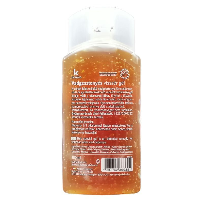 A vadgesztenye-kivonat (eszcin) tartalmú gél rendszeres használata segíthet elkerülni és késleltetni a visszérre jellemző elváltozások kialakulását, súlyosbodását. Mentol tartalma csökkentheti a lábszár viszkető, feszülő érzését. Azonnal beszívódik, zsíros nyomot nem hagy. Kellemesen hűsíthet. Ajánlott kismamák részére is a terhesség alatt fellépő visszeres problémák esetén. Szoptatás alatt is alkalmazható. Tartósítószert, mesterséges illat- és színezőanyagot nem tartalmaz. Hypoallergen. Gyógyszerészek által fejlesztett.