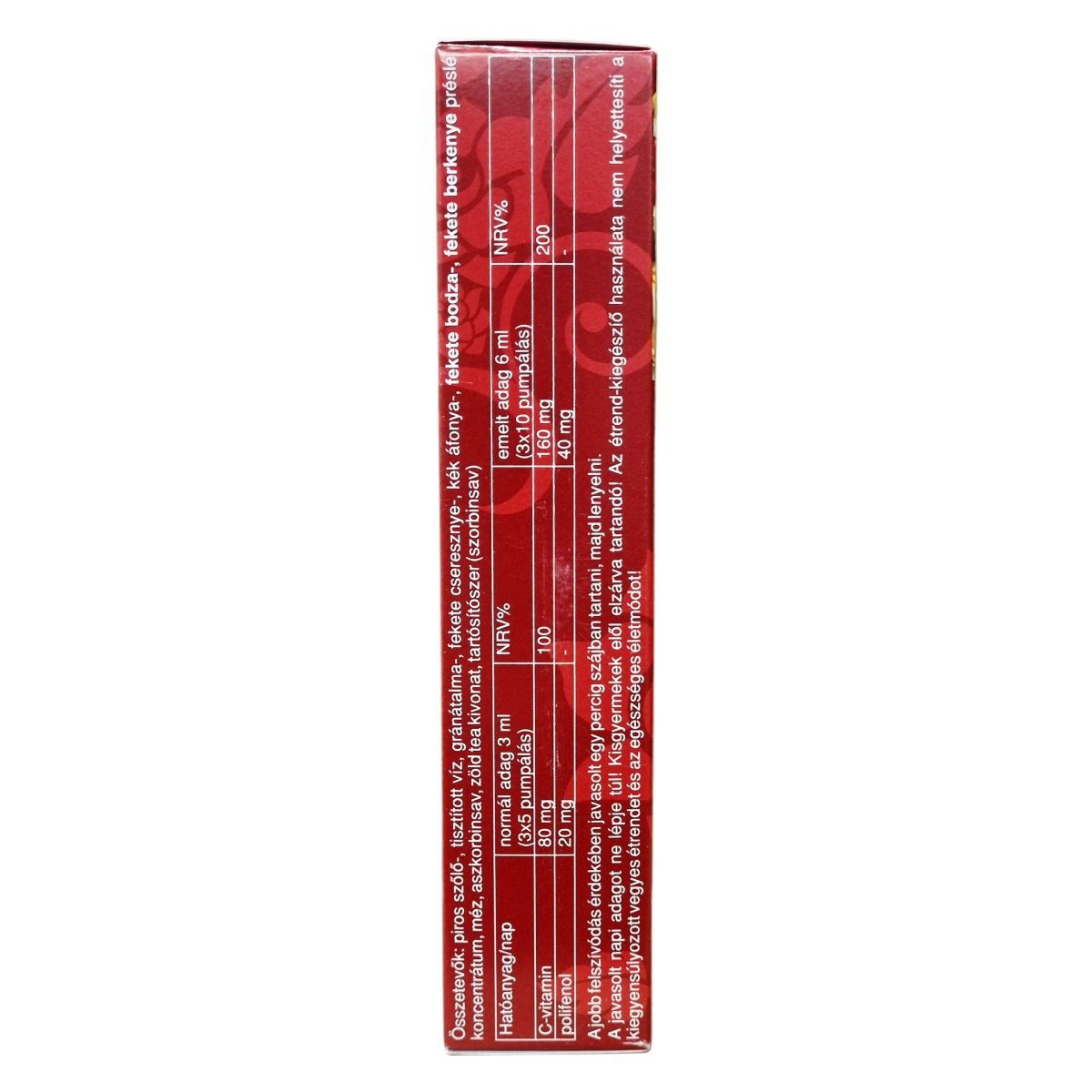 piros szőlő, tisztított víz, gránátalma préslé koncentrátum, fekete cseresznye préslé koncentrátum, kék áfonya préslé koncentrátum, fekete bodza préslé koncentrátum, fekete berkenye préslé koncentrátum, méz, zöld tea kivonat, tartósítószer (szorbinsav)
