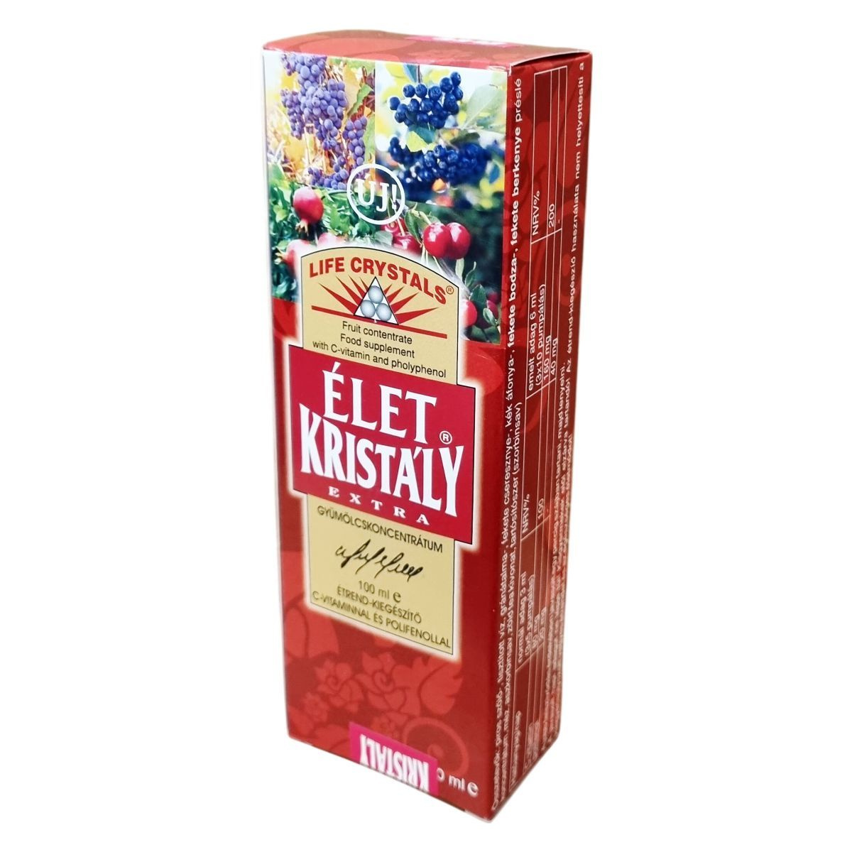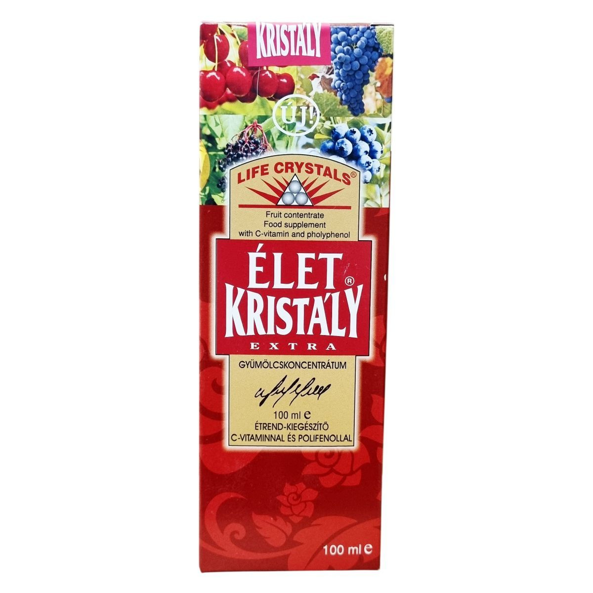 Az Élet Kristály Extra gyümölcskoncentrátum többféle gyümölcs préslé koncentrátumából és kivonatából áll, például piros szőlőből, gránátalmából, fekete cseresznyéből, kék áfonyából, fekete bodzából és fekete berkenyéből. Mézzel és zöld tea kivonattal egészül ki, tartósítószerként pedig szorbinsavat tartalmaz. A jobb felszívódás érdekében javasolt az adag szájban tartása egy percig, majd lenyelése. A termék 100 ml kiszerelésben érhető el, és természetes összetevőinek köszönhetően étrend-kiegészítőként alkalmazható a kiegyensúlyozott táplálkozás és egészséges életmód részeként.
