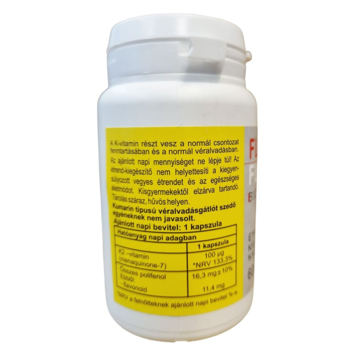 A Flavitamin K2-vitamin kapszula egy étrend-kiegészítő, amely K2-vitamint és bioflavonoidokat tartalmaz. A termék célja, hogy támogassa a normál csontozat fenntartását és a normál véralvadást. A kapszula polifenol tartalmú, amely különböző gyümölcsök és növények szárítmányából származik. A termék használata során fontos, hogy ne lépjük túl az ajánlott napi mennyiséget, és tartsuk távol kisgyermekektől. A kapszula nem helyettesíti a kiegyensúlyozott étrendet és az egészséges életmódot. Kumarin típusú véralvadásgátlót szedők számára nem ajánlott.