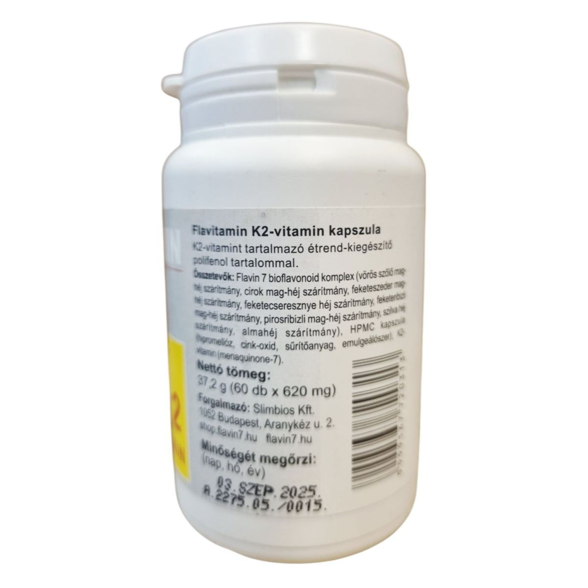 Flavin 7 bioflavonoid komplex (vörös szőlő mag-héj szárítmány, cirok mag-héj szárítmány, feketeszeder mag-héj szárítmány, fekete cseresznye héj szárítmány, pirosribizli mag-héj szárítmány, szilva héj szárítmány, almalehéj szárítmány), HPMC kapszula (hidroxipropil-metilcellulóz, cink-oxid, színezőanyag, emulgeálószer), K2-vitamin (menakinon-7).
