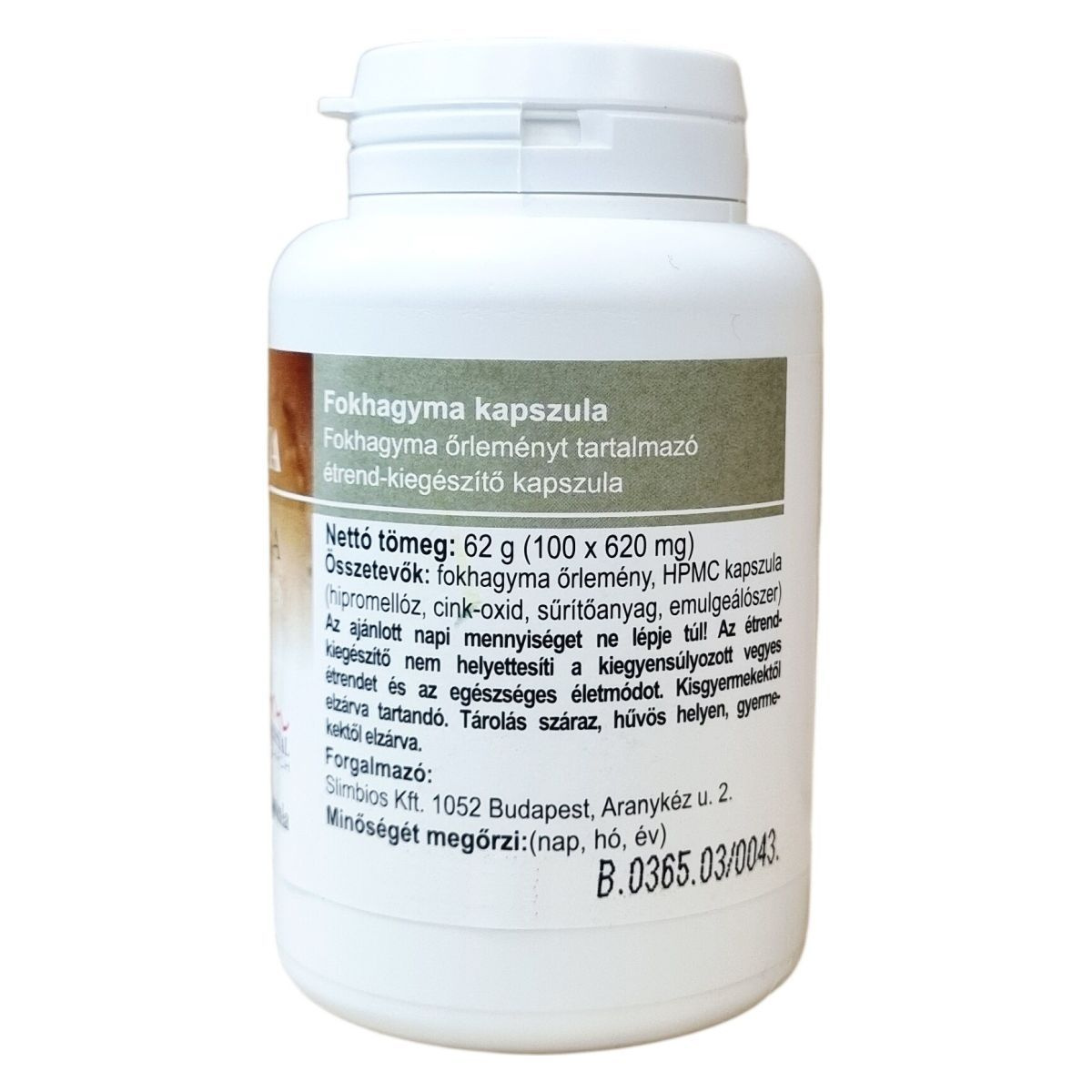 fokhagyma őrlemény, HPMC kapszula (hipromellóz, cink-oxid, sűrítőanyag, emulgeálószer)