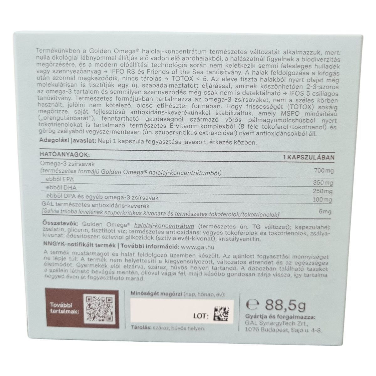 Termékünkben a Golden Omega® halolaj-koncentrátum természetes változatát alkalmazzuk, amely nulla ökológiai lábnyommal előállított apróhalakból készül, biodiverzitást figyelembe vevő halászatból. IFFO RS és Friends of the Sea tanúsítványokkal rendelkezik. A halak feldolgozása a kifogás után azonnal megtörténik, nincs TMAO, alacsony TOTOX érték. Szabadalmaztatott eljárás során az omega-3 tartalom és stabilitás megmarad. A terméket antioxidáns-keverékkel stabilizálták, mely MSPO minősítésű pálmaolajból és természetes E-vitamin-komplexből áll (8 féle tokoferol + tokotrienol). Természetes formában tartalmazza az omega-3 zsírsavakat, nem etil-észter formában. A termék TÜV ISO 9001:2015 tanúsított folyamatok szerint készült. A GAL egy tiszta alapanyagokból készülő vitamincsalád, amely a fenntartható fejlődést támogatja. It’s our future.