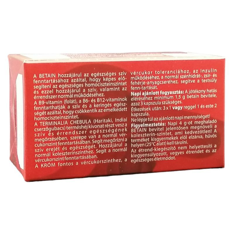 Betain alapú étrend-kiegészítő kapszula B-vitaminokkal és krómmal. Összetevők: Betain, Terminalia Chebula kivonat, B6-vitamin, B12-vitamin, B9-vitamin (folát), Króm