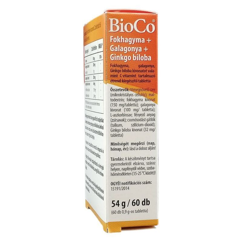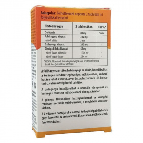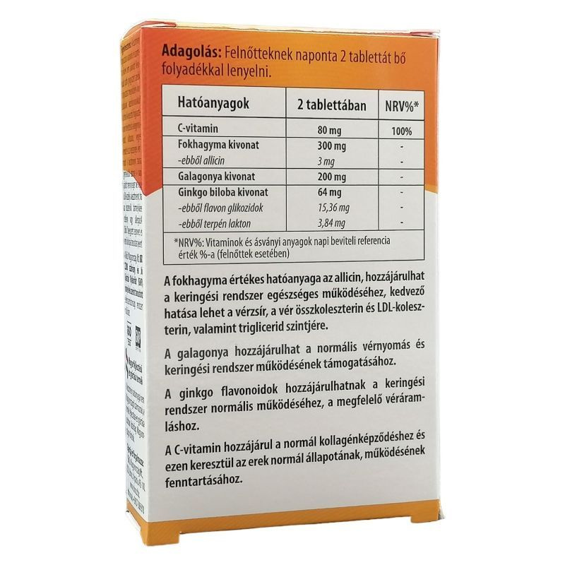 Adagolás: naponta 2 tablettát bő folyadékkal lenyelni. Hatóanyagok 2 tablettában: Fokhagyma kivonat: 300 mg -ebből allicin: 3 mg, Galagonya kivonat: 200 mg, Ginkgo biloba kivonat: 64 mg -ebből flavon glikozidok: 15,36 mg -ebből terpén lakton: 3,84 mg, C-vitamin: 80 mg. Összetevők: tömegnövelő szer (mikrokristályos cellulóz); maltodextrin; fokhagyma kivonat (150 mg/tabletta); galagonya kivonat (100 mg/tabletta); L-aszkorbinsav; fényező anyag (sztearinsav); csomósodást gátlók (talkum, szilícium-dioxid); Ginkgo biloba kivonat (32 mg/tabletta). 54 g / 60 db. OÉTI notifikációs szám: 15191/2014. Tárolás: A készítményt tartsa gyermekektől elzárva, száraz helyen, napfénytől védve, legfeljebb 25 °C-on! Figyelmeztetés: A készítmény fogyasztása várandós és szoptató nőknek nem ajánlott! Véralvadást gátló gyógyszert szedők a fogyasztást megelőzően konzultáljanak kezelőorvosukkal! Az étrend-kiegészítő fogyasztása nem helyettesíti a kiegyensúlyozott, változatos, vegyes étrendet és az egészséges életmódot. A készítményt tartsa gyermekektől elzárva! A napi ajánlott mennyiséget ne lépje túl! Ne szedje a készítményt, ha az összetevők bármelyikére érzékeny vagy allergiás!