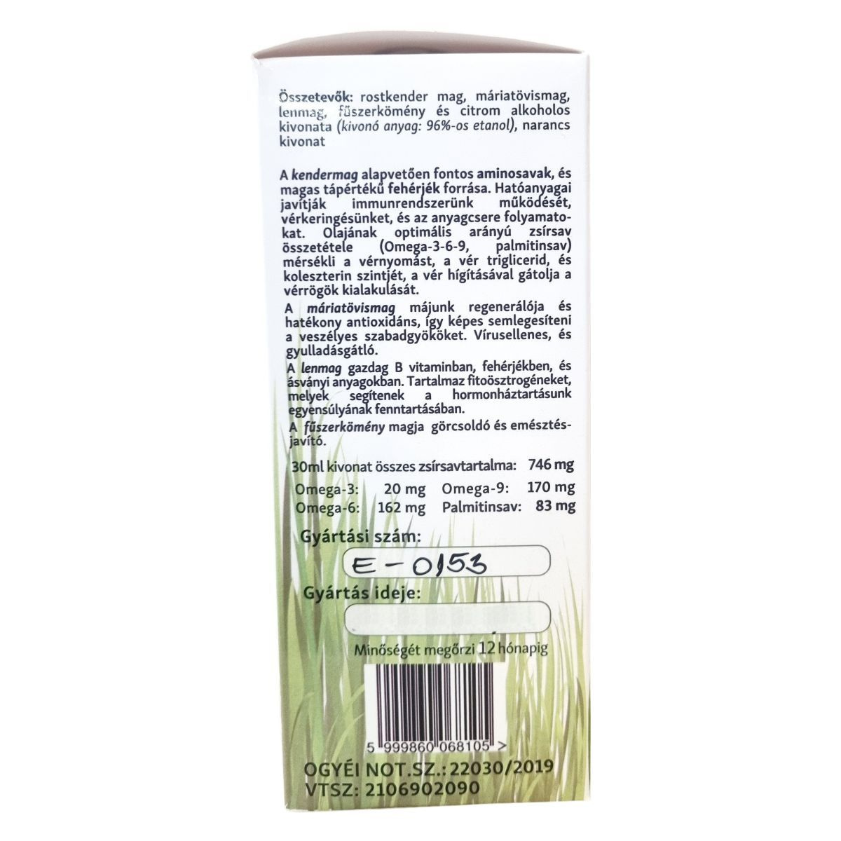 A készítmény rostkender-, máriatövis-, len- és fűszerköménymag kivonatait tartalmazza. A kendermag Omega-3, -6 és -9 zsírsavakat biztosít, hozzájárul a normál koleszterin- és trigliceridszint fenntartásához és az immunrendszer normál működéséhez. A máriatövis támogatja a máj regeneráló és antioxidáns folyamatait, a lenmag tápanyagokban gazdag, a fűszerkömény az emésztési funkciók javítását segíti. Az étrend-kiegészítő használata nem helyettesíti a kiegyensúlyozott, vegyes étrendet és az egészséges életmódot.