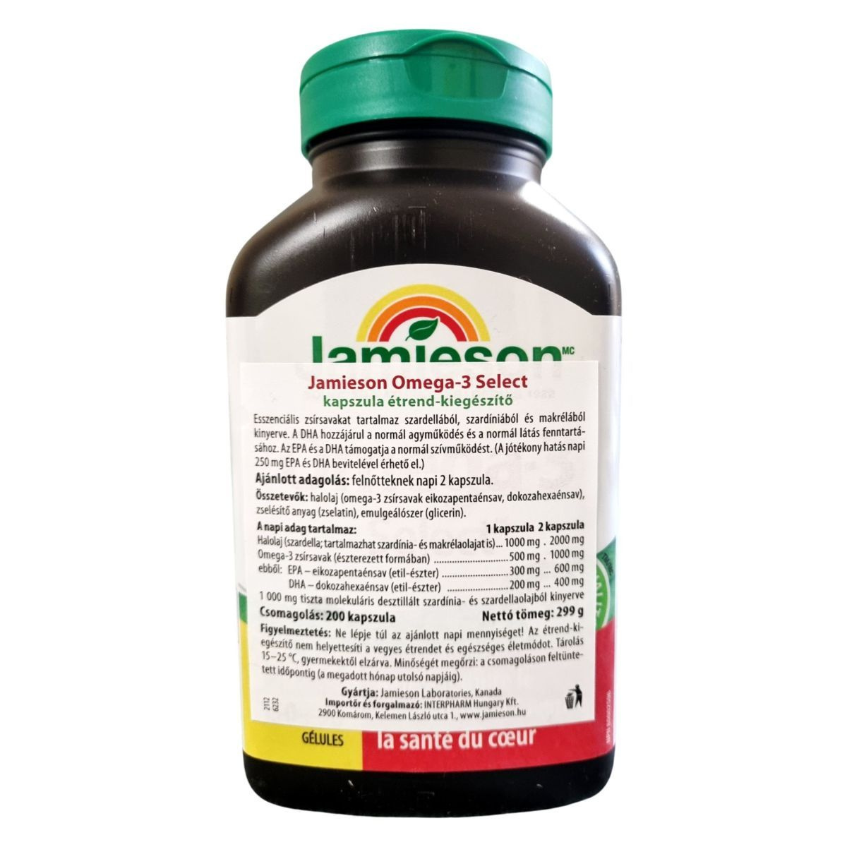A Jamieson Omega-3 Select kapszula esszenciális zsírsavakat tartalmaz, amelyeket szardellából, szardíniából és makrélából nyernek ki. A termék célja, hogy támogassa a szív egészségét és hozzájáruljon a normál agyműködéshez és látáshoz. A kapszulák molekulárisan desztillált halolajat tartalmaznak, amely mentes a nehézfémektől, PCB-ktől, dioxinoktól, higanytól és ólomtól. A termék nem tartalmaz GMO-t, keményítőt, glutént, laktózt, mesterséges színezékeket, ízesítőket vagy tartósítószereket. A kapszulákat Kanadában gyártják, és a minőségüket a 360° Quality™ program biztosítja.