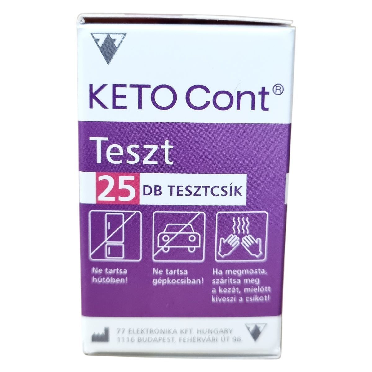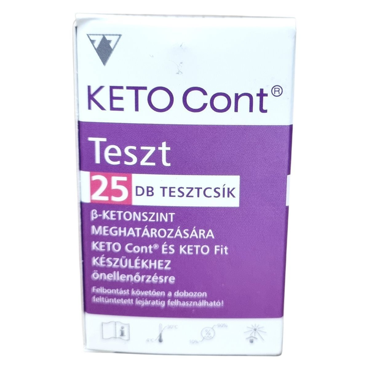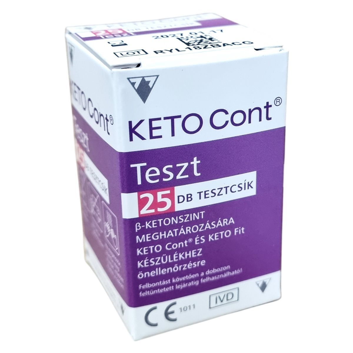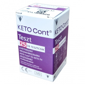 A KETO Cont Teszt β-ketonszint meghatározására szolgáló in vitro diagnosztikai tesztcsík. A termék önellenőrzésre készült, és a KETO Cont, valamint a KETO Fit készülékekkel kompatibilis. A csomag 25 darab tesztcsíkot tartalmaz. Felbontást követően a dobozon feltüntetett lejáratig felhasználható.