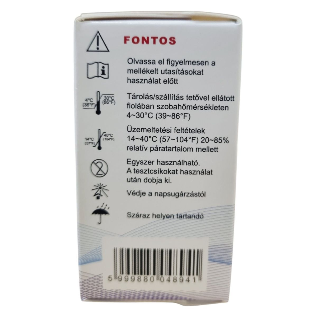 FONTOS! Olvassa el figyelmesen a mellékelt utasításokat használat előtt. Egyszer használható. A tesztcsíkokat használat után dobja ki.