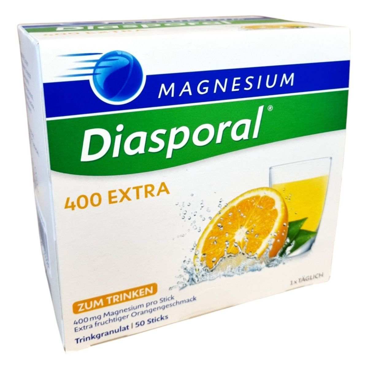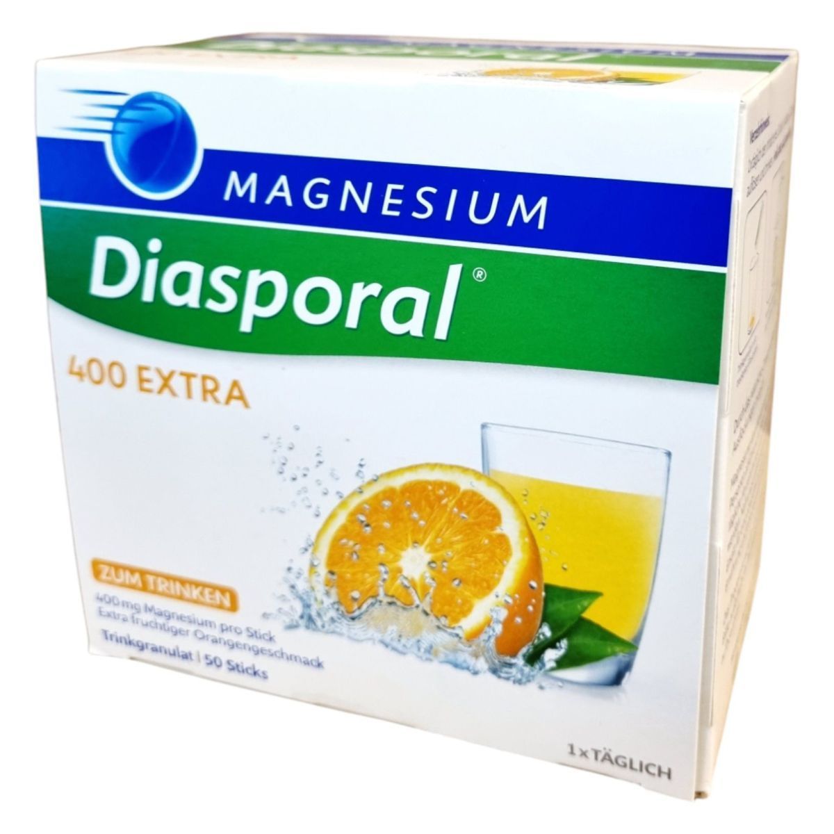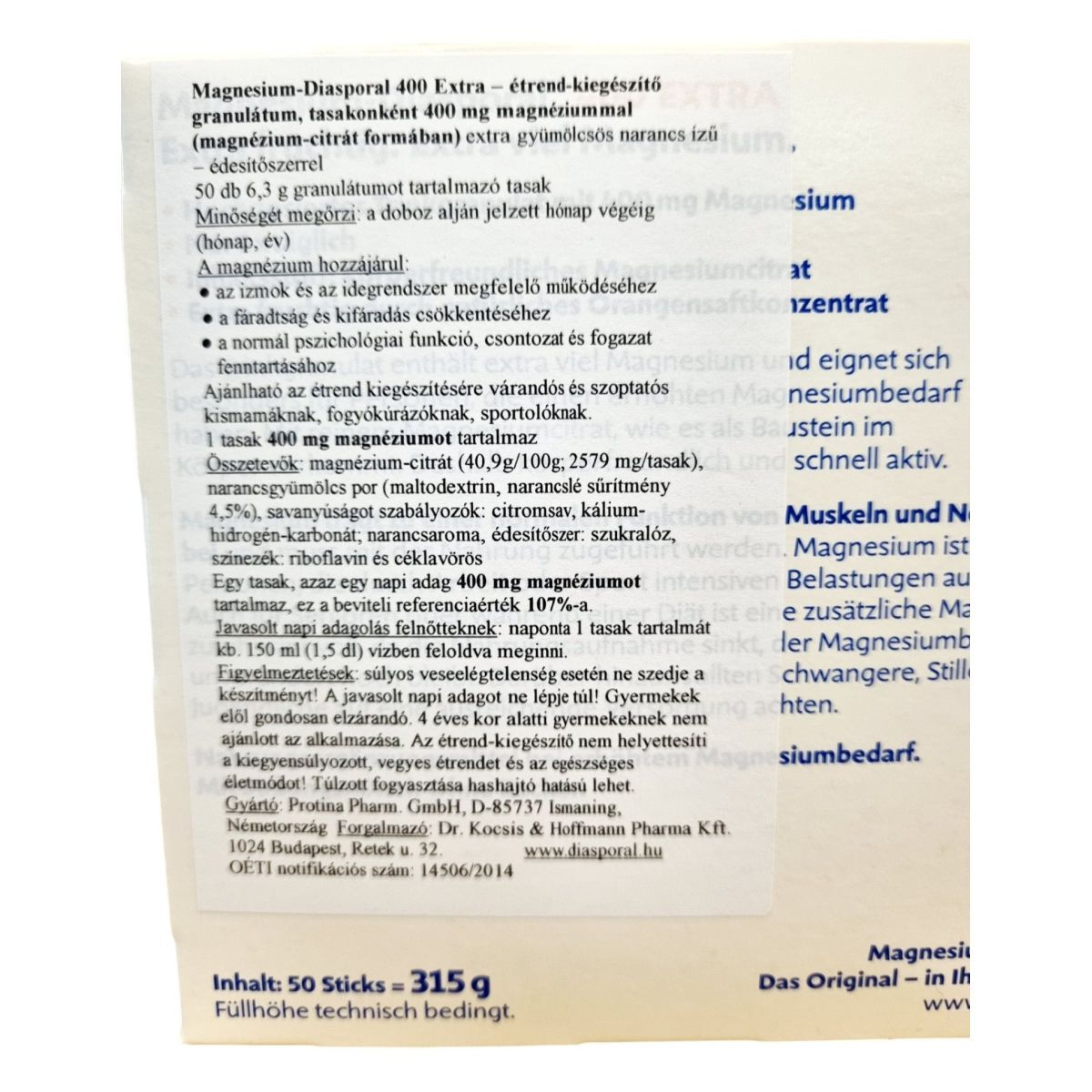 A Magnesium-Diasporal 400 Extra egy étrend-kiegészítő granulátum, amely tasakonként 400 mg magnéziumot tartalmaz magnézium-citrát formában. Az extra gyümölcsös narancs ízű készítmény édesítőszerrel van ízesítve, és 50 db 6,3 g granulátumot tartalmazó tasakot tartalmaz. A magnézium hozzájárulhat az izmok és az idegrendszer megfelelő működéséhez, a fáradtság és kifáradás csökkentéséhez, valamint a normál pszichológiai funkció, csontozat és fogazat fenntartásához. Ajánlható az étrend kiegészítésére várandós és szoptatós kismamáknak, fogyókúrázóknak, sportolóknak. A termék nem helyettesíti a kiegyensúlyozott, vegyes étrendet és az egészséges életmódot, és túlzott fogyasztása hashajtó hatású lehet. Gyártója a Protina Pharm. GmbH, forgalmazója pedig a Dr. Kocsis & Hoffmann Pharma Kft.