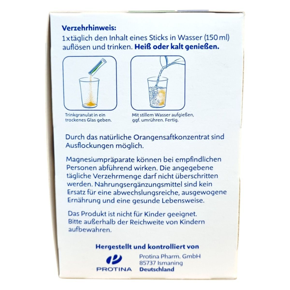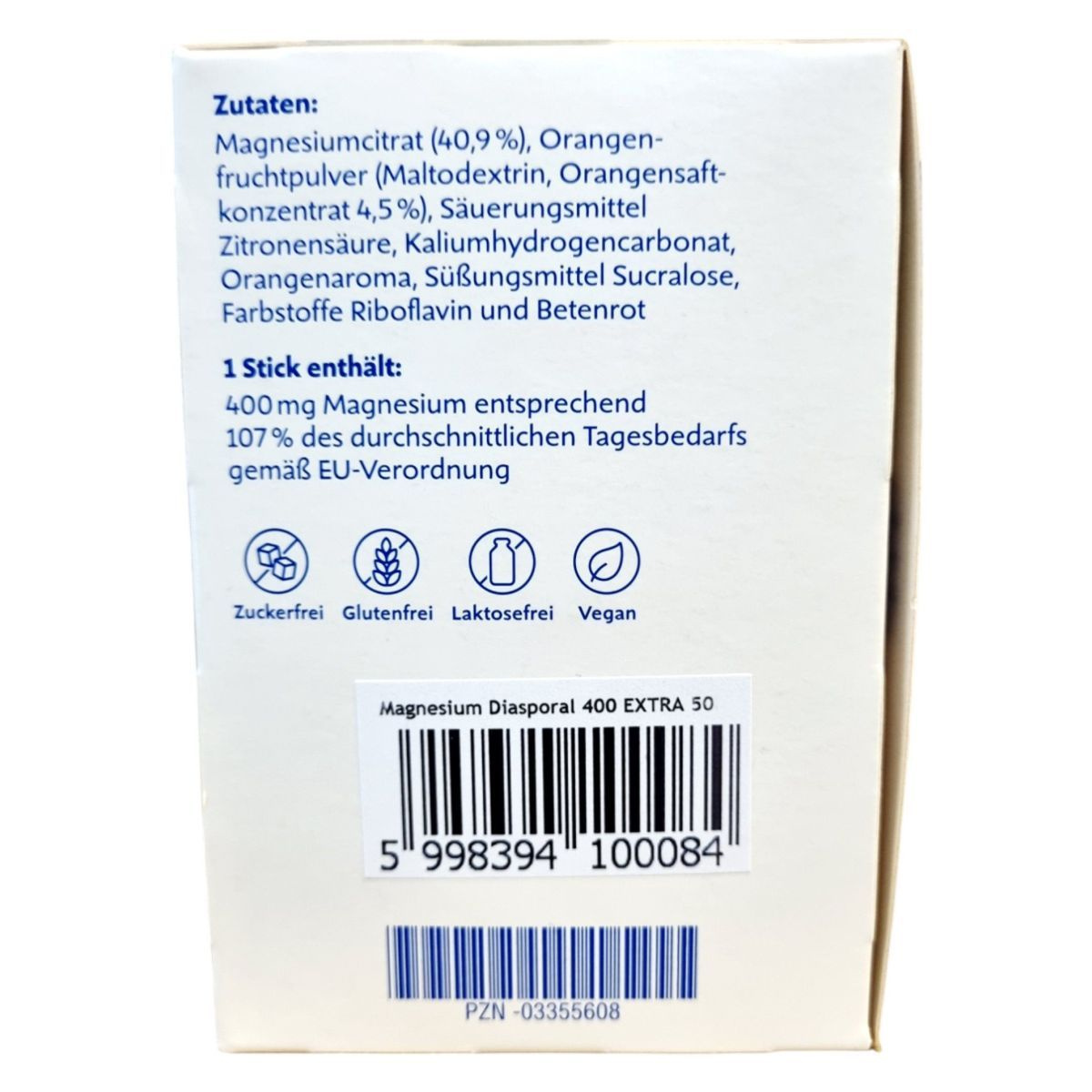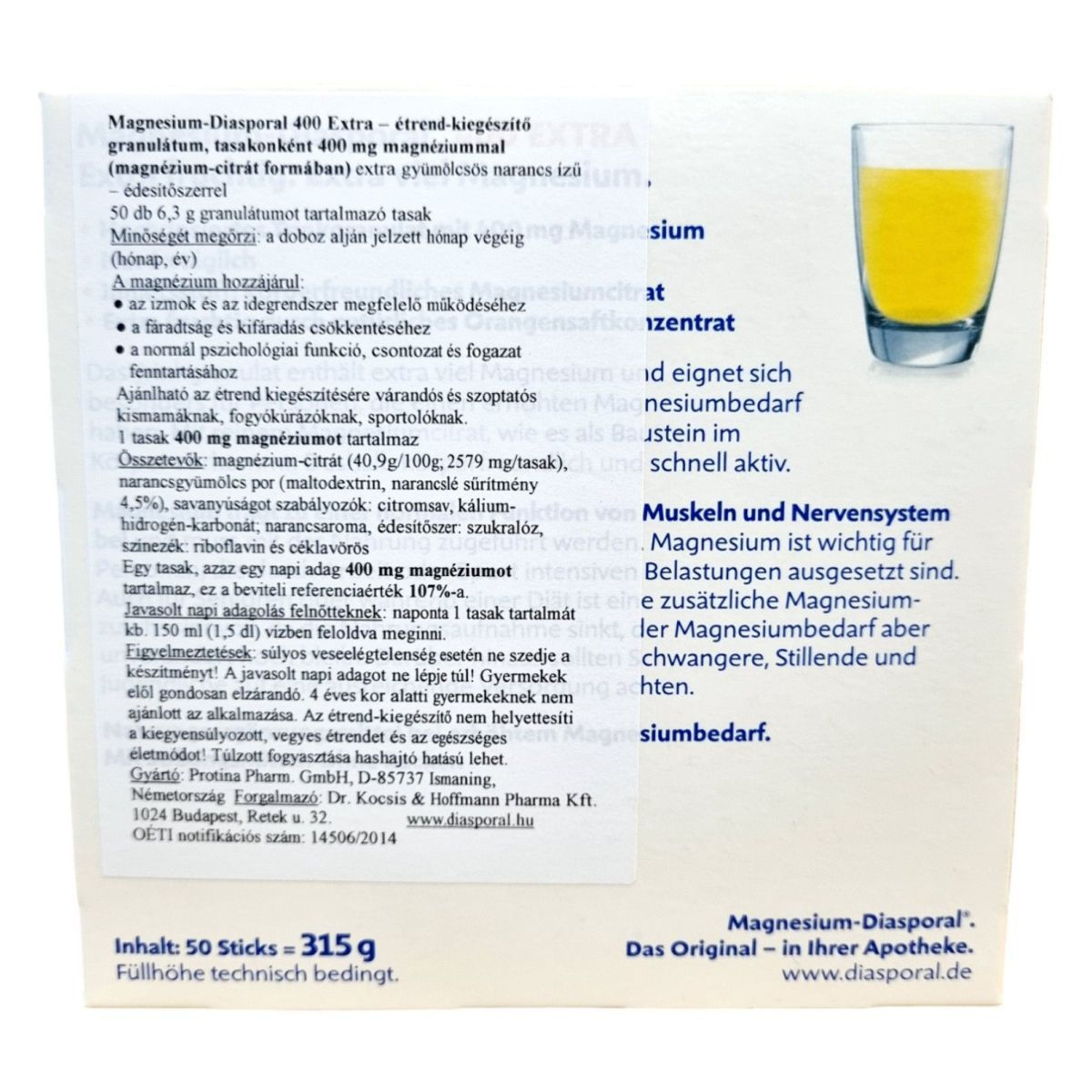 A Magnesium-Diasporal 400 Extra egy étrend-kiegészítő granulátum, amely tasakonként 400 mg magnéziumot tartalmaz magnézium-citrát formában. Az extra gyümölcsös narancs ízű készítmény édesítőszerrel van ízesítve, és 50 db 6,3 g granulátumot tartalmazó tasakot tartalmaz. A magnézium hozzájárulhat az izmok és az idegrendszer megfelelő működéséhez, a fáradtság és kifáradás csökkentéséhez, valamint a normál pszichológiai funkció, csontozat és fogazat fenntartásához. Ajánlható az étrend kiegészítésére várandós és szoptatós kismamáknak, fogyókúrázóknak, sportolóknak. A termék nem helyettesíti a kiegyensúlyozott, vegyes étrendet és az egészséges életmódot, és túlzott fogyasztása hashajtó hatású lehet. Gyártója a Protina Pharm. GmbH, forgalmazója pedig a Dr. Kocsis & Hoffmann Pharma Kft.