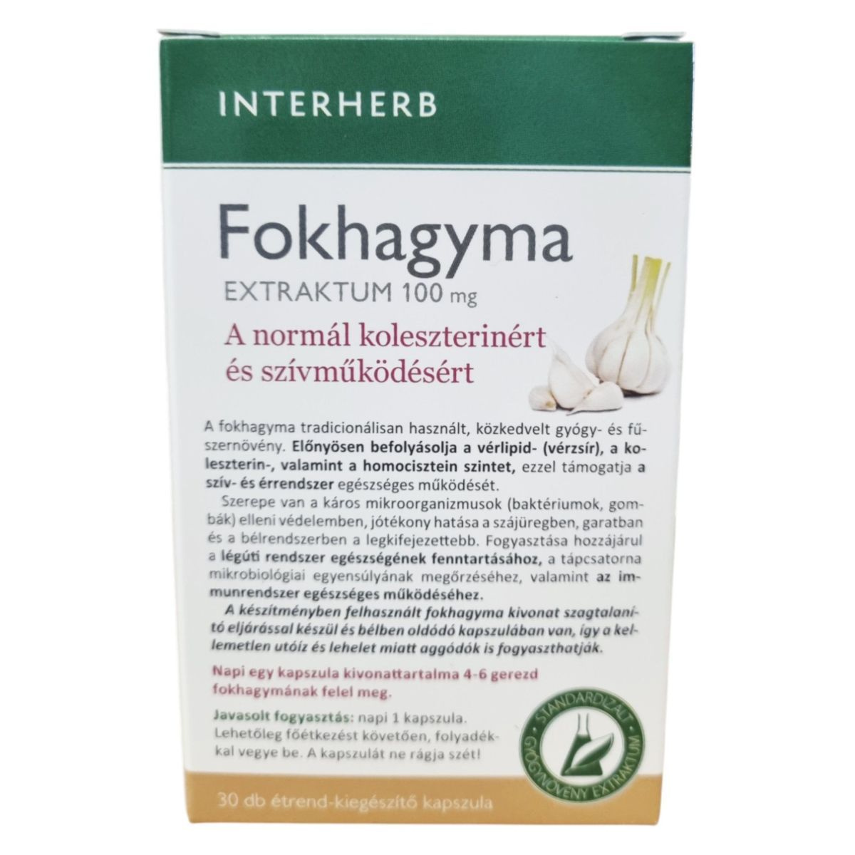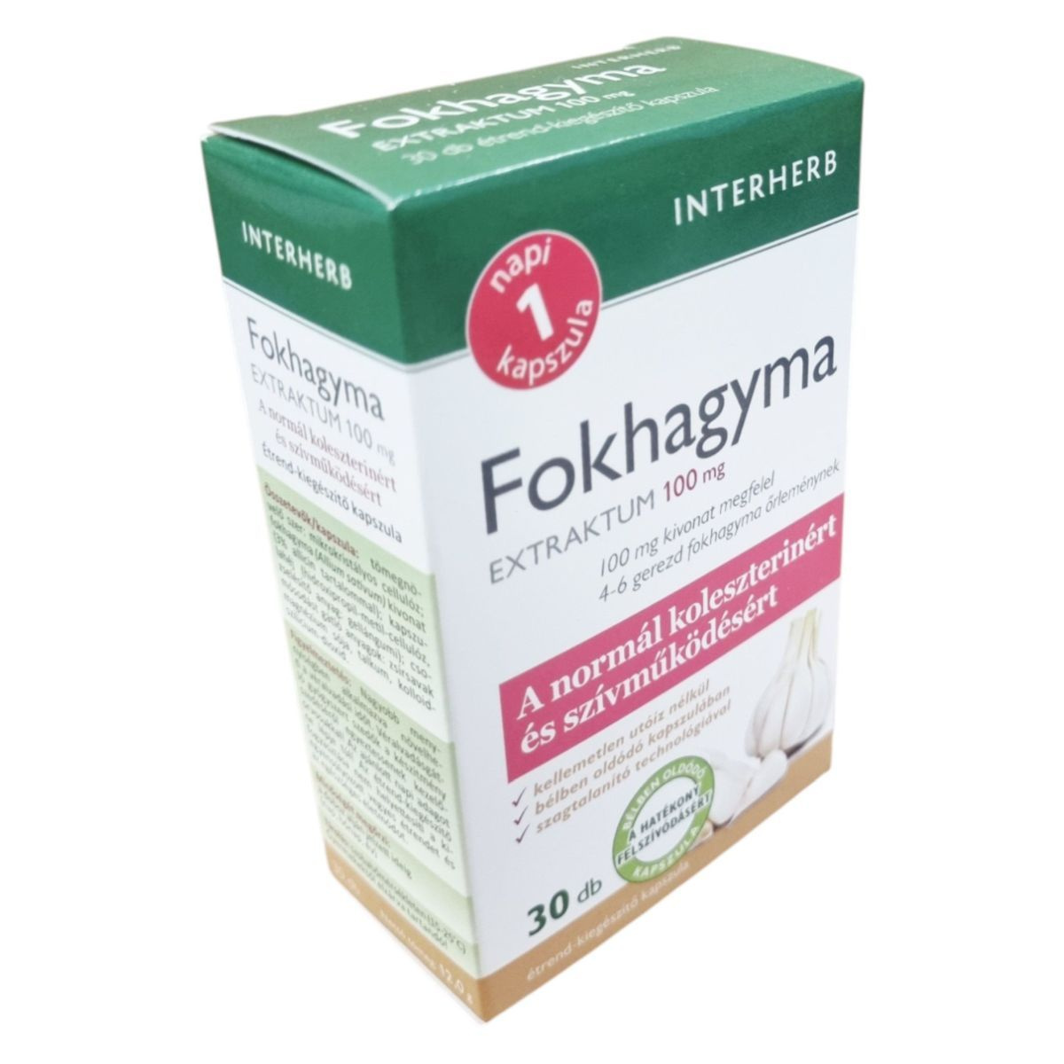 A INTERHERB Fokhagyma EXTRAKTUM 100 mg kapszula a fokhagyma tradicionális előnyeit kínálja, hozzájárulhat a vérlipid- és koleszterinszint szabályozásához, valamint a szív- és érrendszer egészséges működéséhez. A termék szagtalanító eljárással készül, így a fokhagyma kellemetlen utóíze nem érezhető. A bélben oldódó kapszula hatékony felszívódást biztosíthat. A fokhagyma kivonat szerepet játszhat a káros mikroorganizmusok elleni védelemben, és támogathatja az immunrendszer egészséges működését.