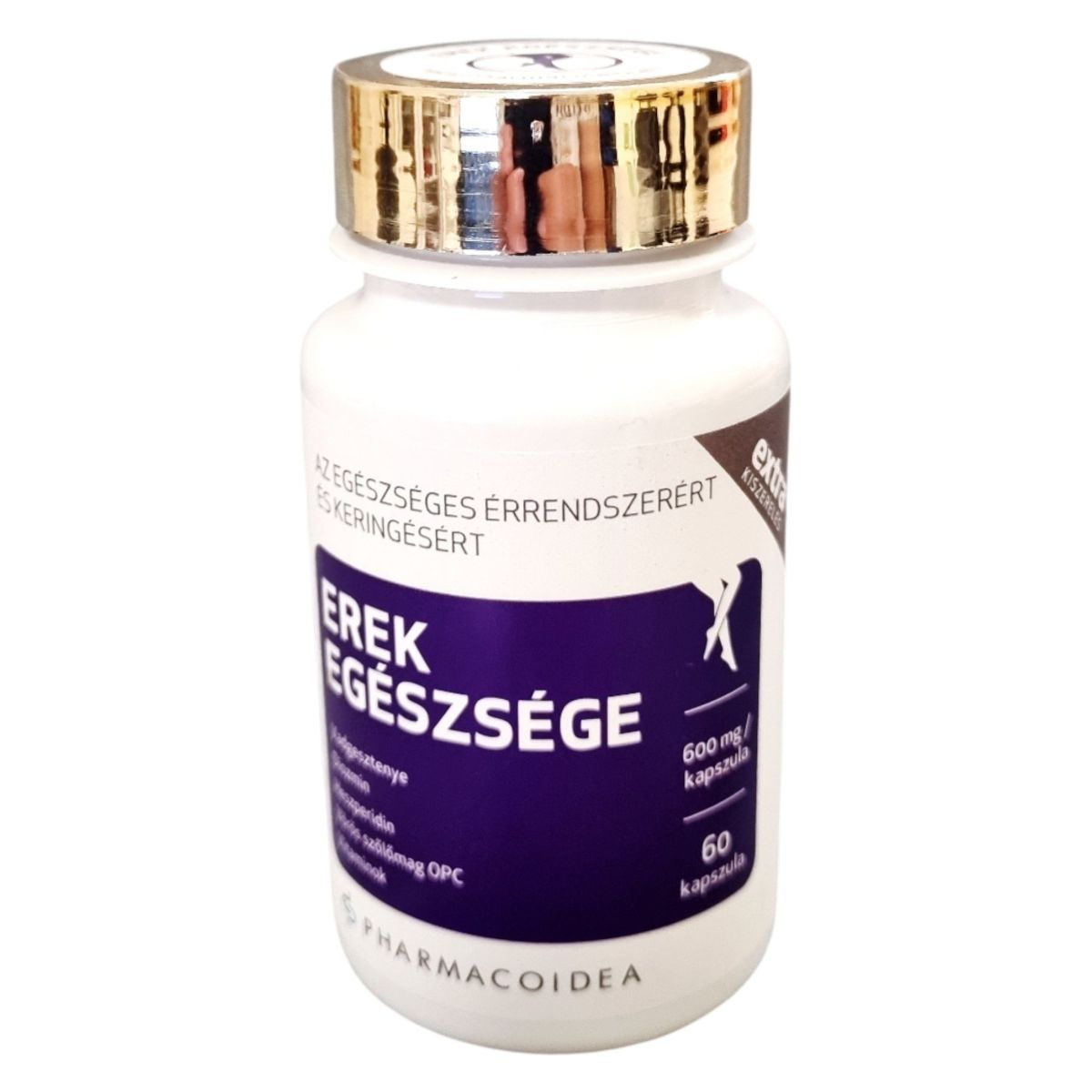 Az EREK EGÉSZSÉGE étrend-kiegészítő napi 1 kapszulája hozzájárulhat a vérerek egészséges működéséhez, a kollagén képződéséhez, és csökkentheti a fáradtságérzetet. A termék elősegítheti az egészséges vérkeringést és a vénás véráramlást a lábakban, valamint támogathatja a sejtek oxidatív stresszel szembeni védekezését. A hatóanyagok között megtalálható a vadgesztenye aescin, diozmin, vörös szőlőmag proantocianidinek, C-vitamin, heszperidin és a-tokoferol (E-vitamin). A termék gyártója a Pharmacoidea Kft., és az OGYÉI notifikációs száma 15875/2015.