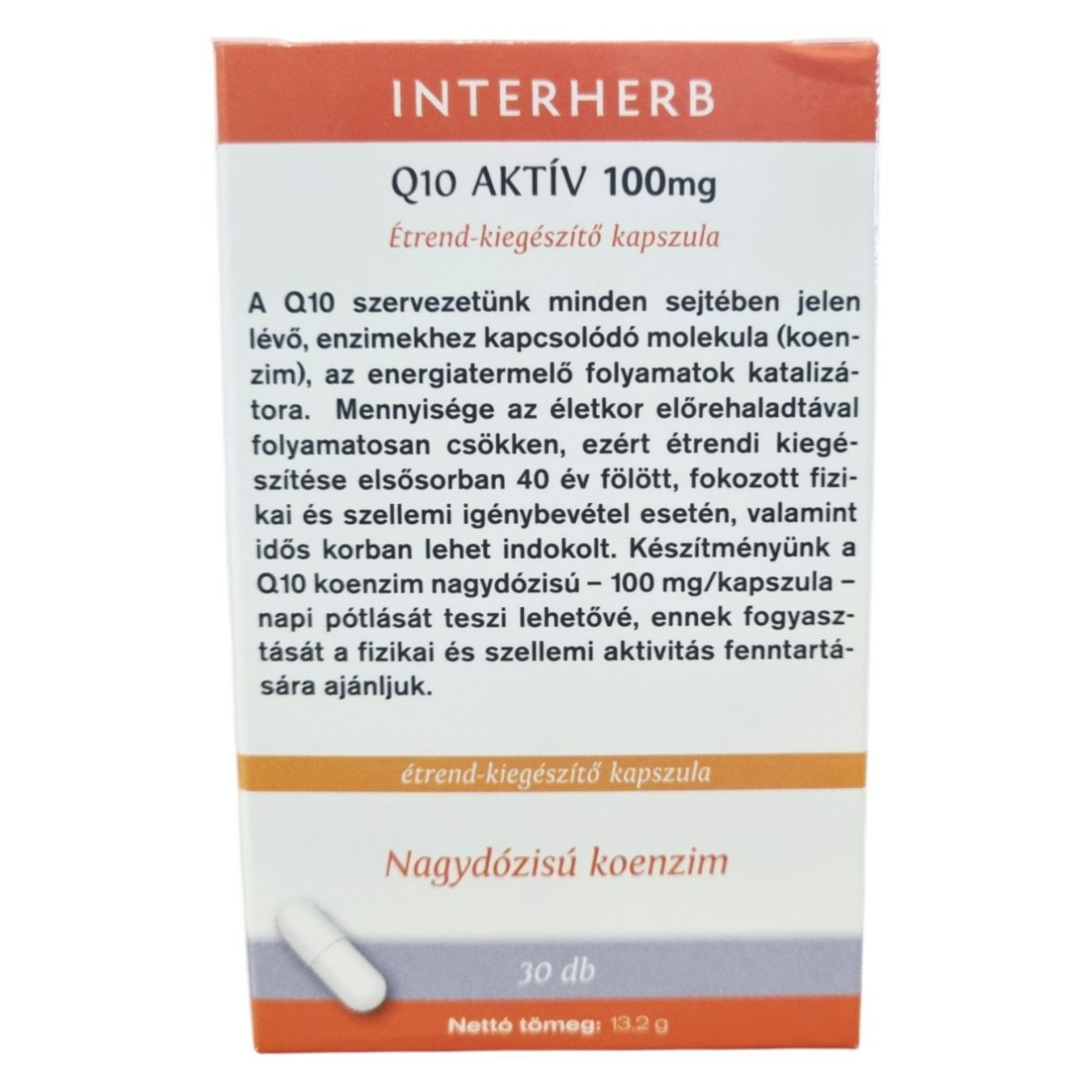 A Q10 AKTÍV 100 mg kapszula egy nagydózisú koenzim Q10-et tartalmazó étrend-kiegészítő, amely segíthet az energiatermelő folyamatok támogatásában. A termék 30 kapszulát tartalmaz, nettó tömege 13,2 g. A koenzim Q10 az enzimekhez kapcsolódó molekula, amely minden sejtünkben jelen van, és az életkor előrehaladtával mennyisége csökkenhet. A termék fogyasztása különösen 40 év felett, fokozott fizikai és szellemi igénybevétel esetén lehet indokolt. A megbízható minőséget a koncentrált extraktum, a bevizsgált alapanyag és a hazai fejlesztés garantálja.