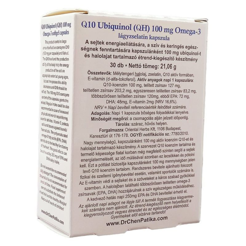 Nagy mennyiségű, kapszulánként 100 mg aktív koenzim Q10-et - a szervezet számára közvetlenül hasznosítható forma (ubiquinol QH), mely így hatékonyabban fejti ki hatását - és halolajat tartalmazó készítmény. A Q10 koenzim antioxidáns tulajdonságánál fogva védi a sejteket az oxidatív stressz ellen, mely a sejtek öregedéséért felelős.