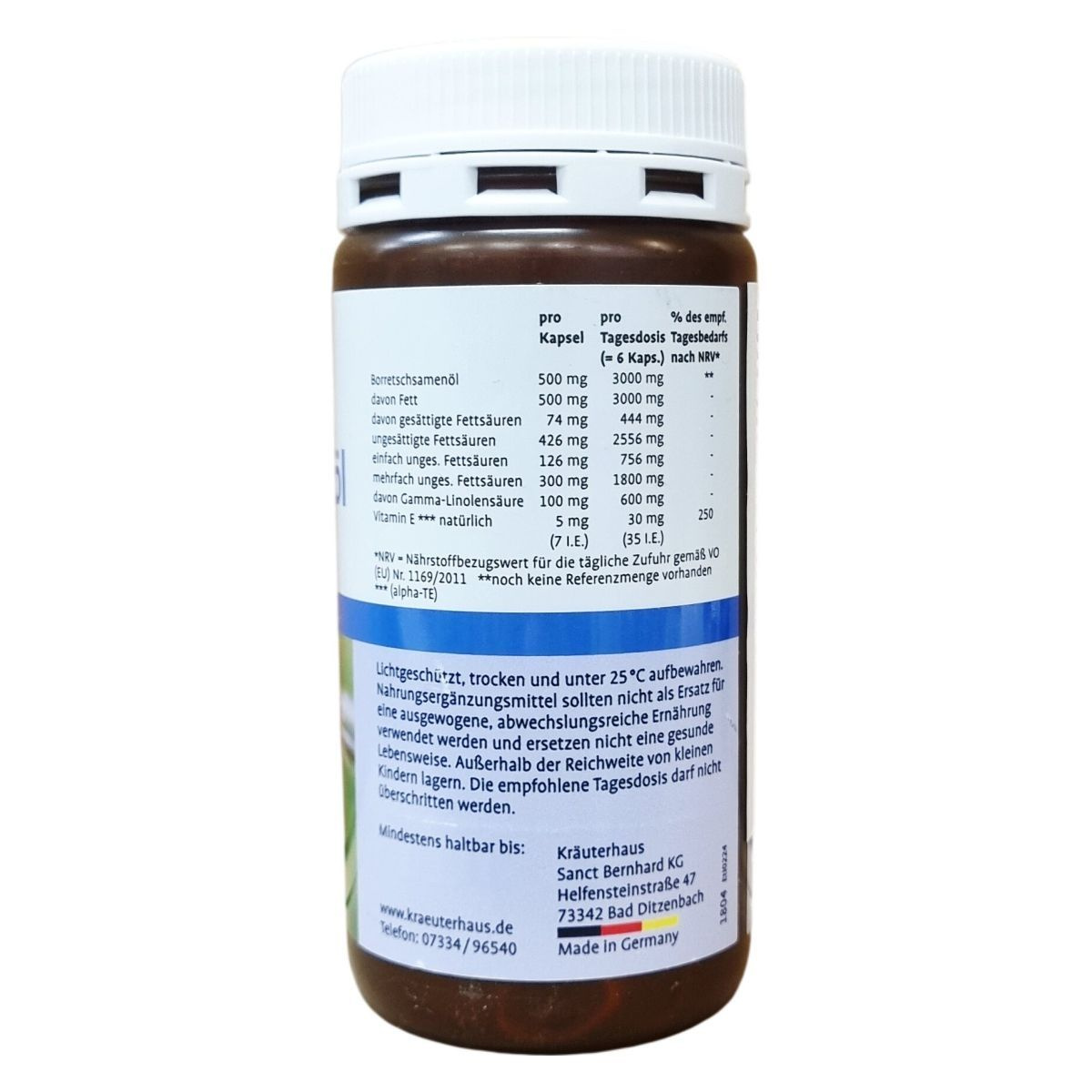 A borágó olaj kapszula egy étrend-kiegészítő, amelyet gamma-linolénsavval és természetes E-vitaminnal gazdagítottak. A kapszula 500 mg borágó olajat tartalmaz kapszulánként, és 180 darabot tartalmazó kiszerelésben érhető el. A termék németországi gyártású, és felhasználási javaslat szerint felnőtteknek napi hatszoros bevitelével javasolt fogyasztani bő folyadékkal, főétkezések előtt. A borágó olaj fő komponense a többszörösen telítetlen zsírsavak közé tartozó gamma-linolénsav. A termék természetes E-vitaminnal egészíti ki az összetételét, amely antioxidáns tulajdonságokkal bírhat. Tárolását fénytől védve, száraz, 25 °C alatti hőmérsékleten javasolt végezni. A készítmény nem helyettesíti a változatos, kiegyensúlyozott étrendet és az egészséges életmódot, gyermekektől elzárva kell tartani, és az ajánlott napi mennyiséget nem szabad túllépni.
