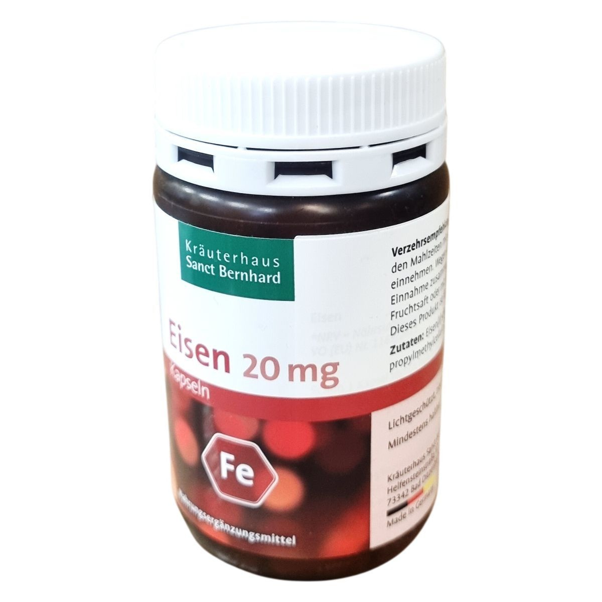 A Kräuterhaus Sanct Bernhard Eisen 20 mg kapszula Németországban készült vas tartalmú étrend-kiegészítő, amely vas-(II)-glükonátot tartalmaz. Egy doboz 120 kapszulát (49 g) foglal magában. A termék fogyasztása javíthatja a szervezet vasellátását, ami kiemelten fontos menstruáció, terhesség, szoptatás és eltérő táplálkozási szokások esetén. Az optimális felszívódás érdekében a kapszulát javasolt vitamin C-tartalmú itallal vagy tablettával egyidejűleg bevenni. A terméket gyermekek nem fogyaszthatják. A kapszulákhoz mesterséges csomósodásgátló anyagként zsírsavak magnéziumsóit használják. A tárolás hűvös, szár száraz és 25 °C alatti hőmérsékleten ajánlott. A márka és gyártó a Kräuterhaus Sanct Bernhard KG, a forgalmazó pedig az ODP Vital Kft.