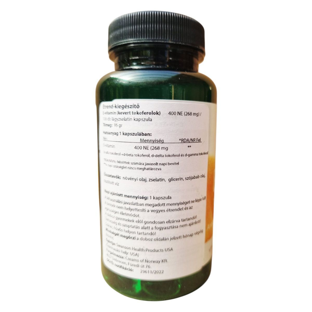 A SWANSON E-400 Mixed Tocopherols egy étrend-kiegészítő, amely 100 lágyzselatin kapszulát tartalmaz. A termék fő hatóanyaga az E-vitamin, amely kevert tokoferolok formájában van jelen, beleértve a d-alpha, d-beta, d-delta és d-gamma tokoferolokat. Az E-vitamin antioxidáns tulajdonságai révén hozzájárulhat a sejtek oxidatív stresszel szembeni védelméhez. A termék összetevői között megtalálható a növényi olaj, zselatin, glicerin, szójabab olaj és tisztított víz. A termék használata során fontos betartani az ajánlott napi mennyiséget, és figyelembe venni a figyelmeztetéseket, különösen terhesség és szoptatás alatt.
