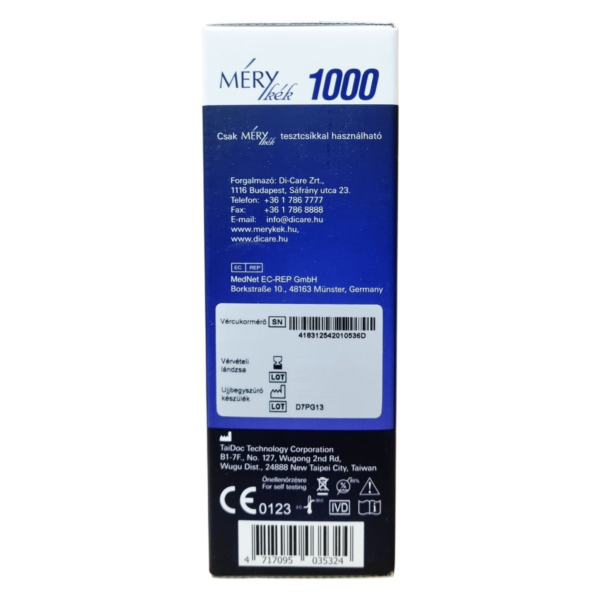 A MÉRY kék vércukor ellenőrző készlet egy komplett csomagot kínál az önálló vércukorszintméréshez. A csomag tartalmazza a vércukorszintmérőt, kezelési útmutatót, ujjbegyszúrót, tíz darab vérvételi lándzsát, mérő tokot, vércukornaplót, jótállási jegyet és egy darab AAA elemet. A készülék 0,5 µL vérmintát igényel, kódolás nélkül működik, és étkezés előtti vagy utáni mérésekhez is alkalmazható, 3 beállítható figyelmeztetéssel. A memória kapacitása 1000 mérés, a reakcióidő 5 másodperc, és ceruzaelemmel (AAA) működik. A mérő hátterében háttérvilágítás, tesztcsík megvilágítás, valamint hangjelzés ki- és bekapcsolási lehetőség is van. A készülék PC csatlakozással és tesztcsík kidobó funkcióval is rendelkezik. A termék kizárólag saját tesztcsíkjaival használható, amelyek garantálják a pontos adatokat. A csomag az önellenőrzést segíti elő, és megfelel az Európai Unió által előírt szabványoknak, valamint CE tanúsítvánnyal rendelkezik. Az eszköz megbízható anyagokból készült, és egyszerű használatot kínál a diabétesz kezelésében érintettek számára.