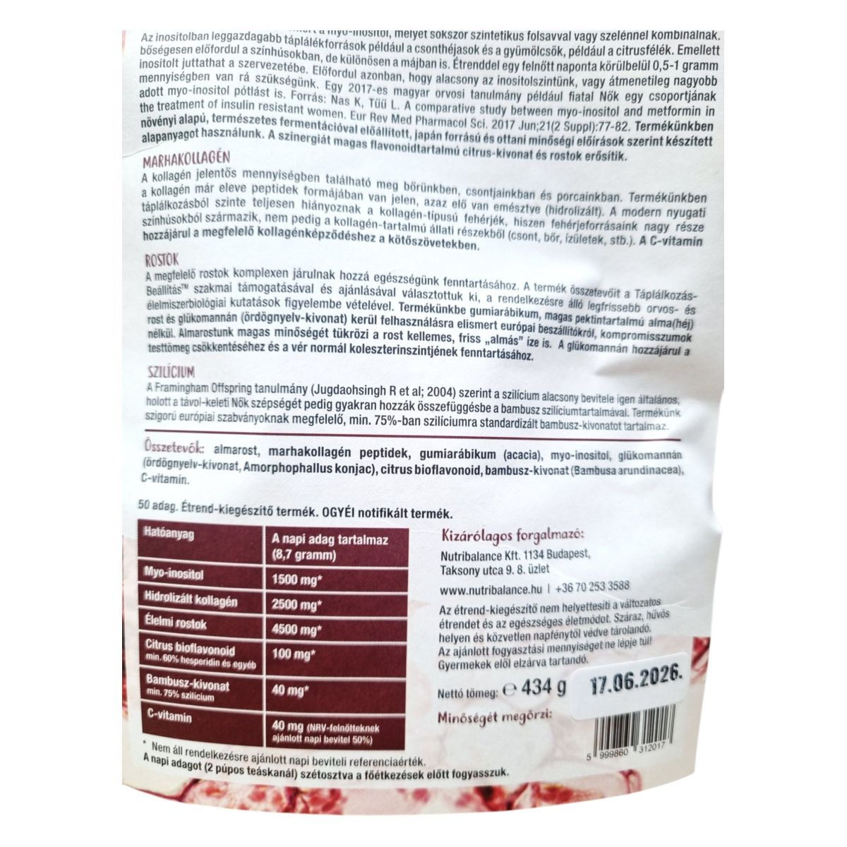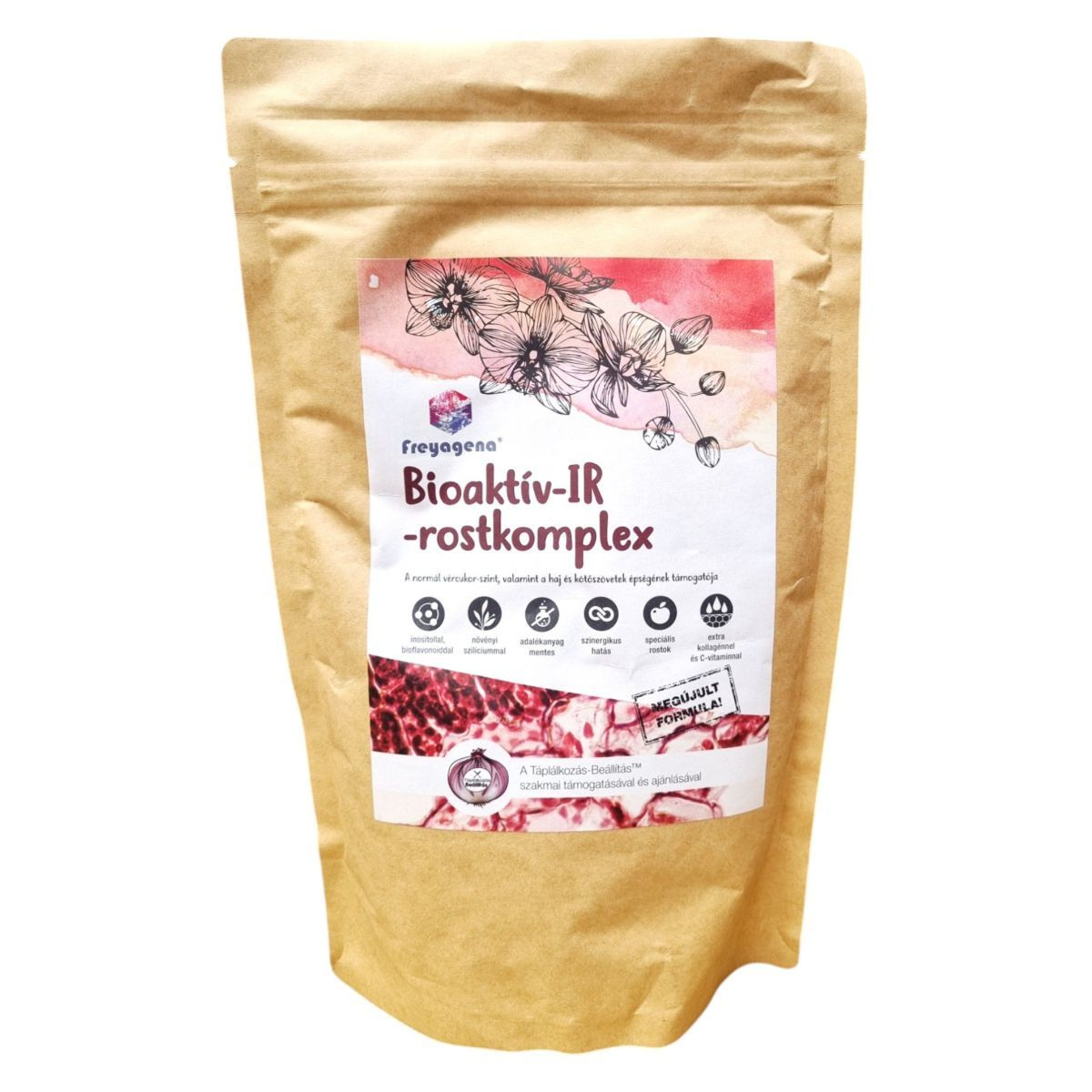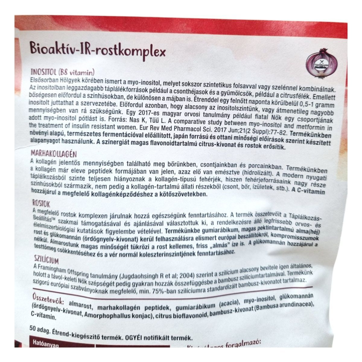 A Bioaktív-IR rostkomplex egy speciális formula, amely inositolt, marhakollagént és C-vitamint tartalmaz. Az inositol, más néven B8 vitamin, különösen hölgyek körében ismert, és hozzájárulhat a normál vércukorszint fenntartásához. A termékben található marhakollagén hidrolizált formában van jelen, ami segíthet a bőr, csontok és porcok egészségének támogatásában. A C-vitamin hozzájárulhat a megfelelő kollagénképződéshez a kötőszövetekben. A termék összetevőit a Táplálkozás-Beállítás™ szakmai támogatásával választották ki, és adalékanyag mentes. A termék gumiarábikumot, glükomannánt, alma héjat és citrus bioflavonoidokat is tartalmazhat, amelyek komplexen járulhatnak hozzá az egészség fenntartásához.