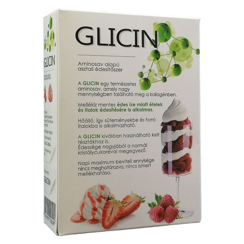 GLICIN SUPERFOOD Különleges táplálkozási célú élelmiszer. A GLICIN egy természetes aminosav, amely nagy mennyiségben található meg a kollagénben. Mellékíz mentes édes íze miatt ételek és italok édesítésére is alkalmas. Hőálló, így süteményekbe és forró italokba is alkalmas. A GLICIN kiválóan használható kelt tésztákhoz is. Édessége kb. normál kristálycukoréval megegyező.