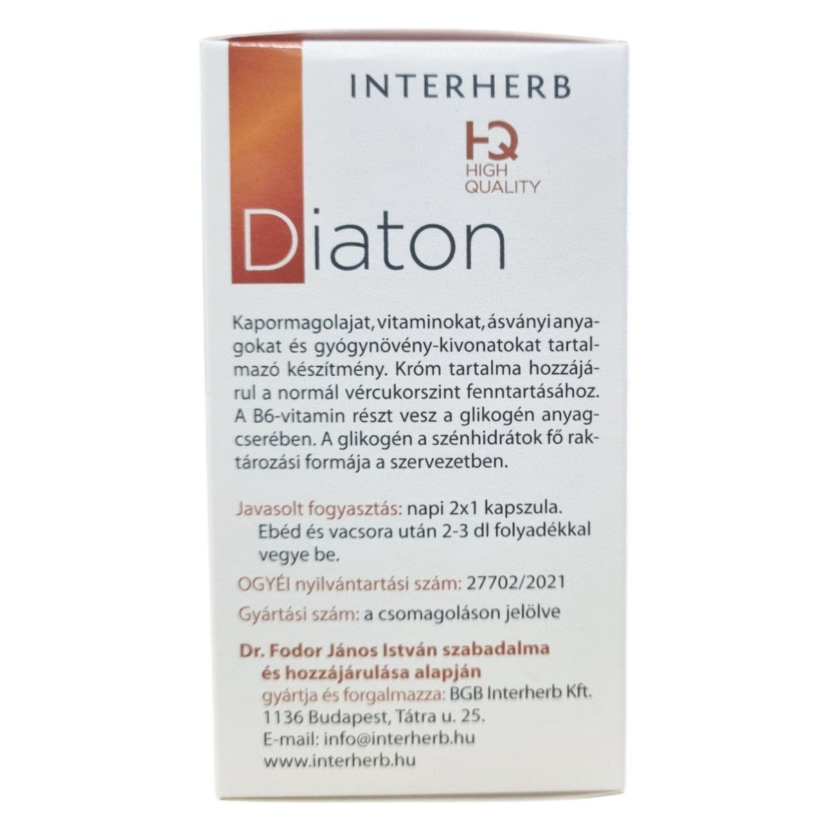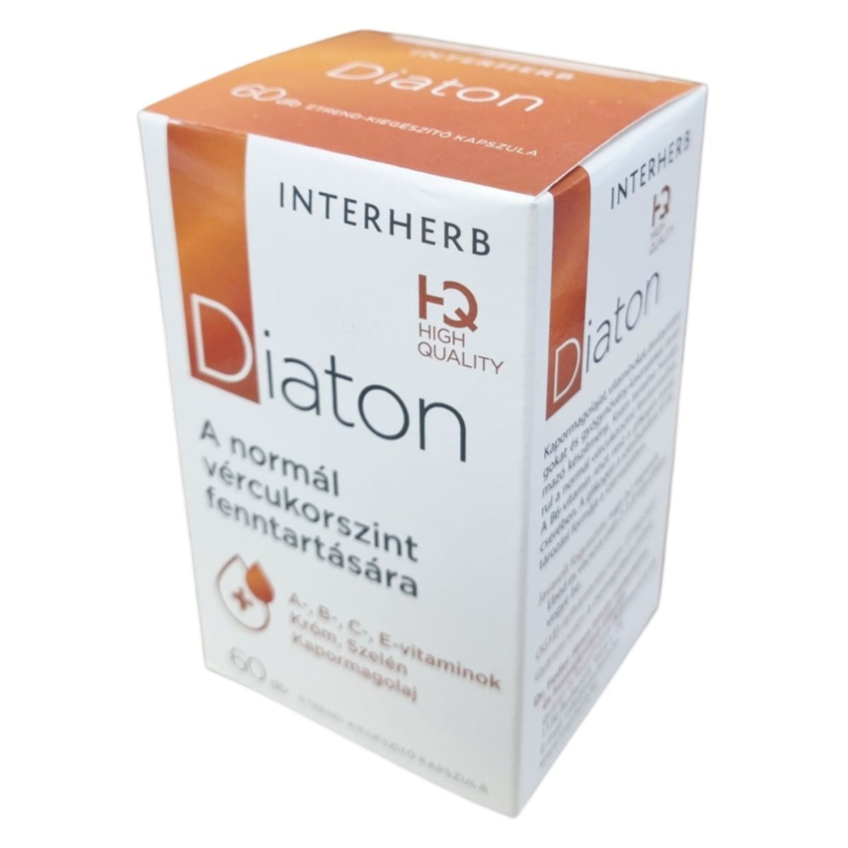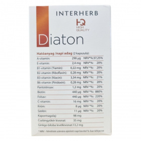 Az INTERHERB HQ HIGH QUALITY Diaton egy komplex étrend-kiegészítő, amely kapormagolajat, vitaminokat, ásványi anyagokat és gyógynövény-kivonatokat tartalmaz. A termék króm tartalma hozzájárulhat a normál vércukorszint fenntartásához, míg a B6-vitamin részt vehet a glikogén anyagcserében. A termék összetevői között megtalálható a csalángyökér és a Ginkgo biloba levélkivonat is. A termék fogyasztása nem javasolt bizonyos egészségügyi állapotok esetén, és fontos, hogy az ajánlott napi adagot ne lépjük túl.
