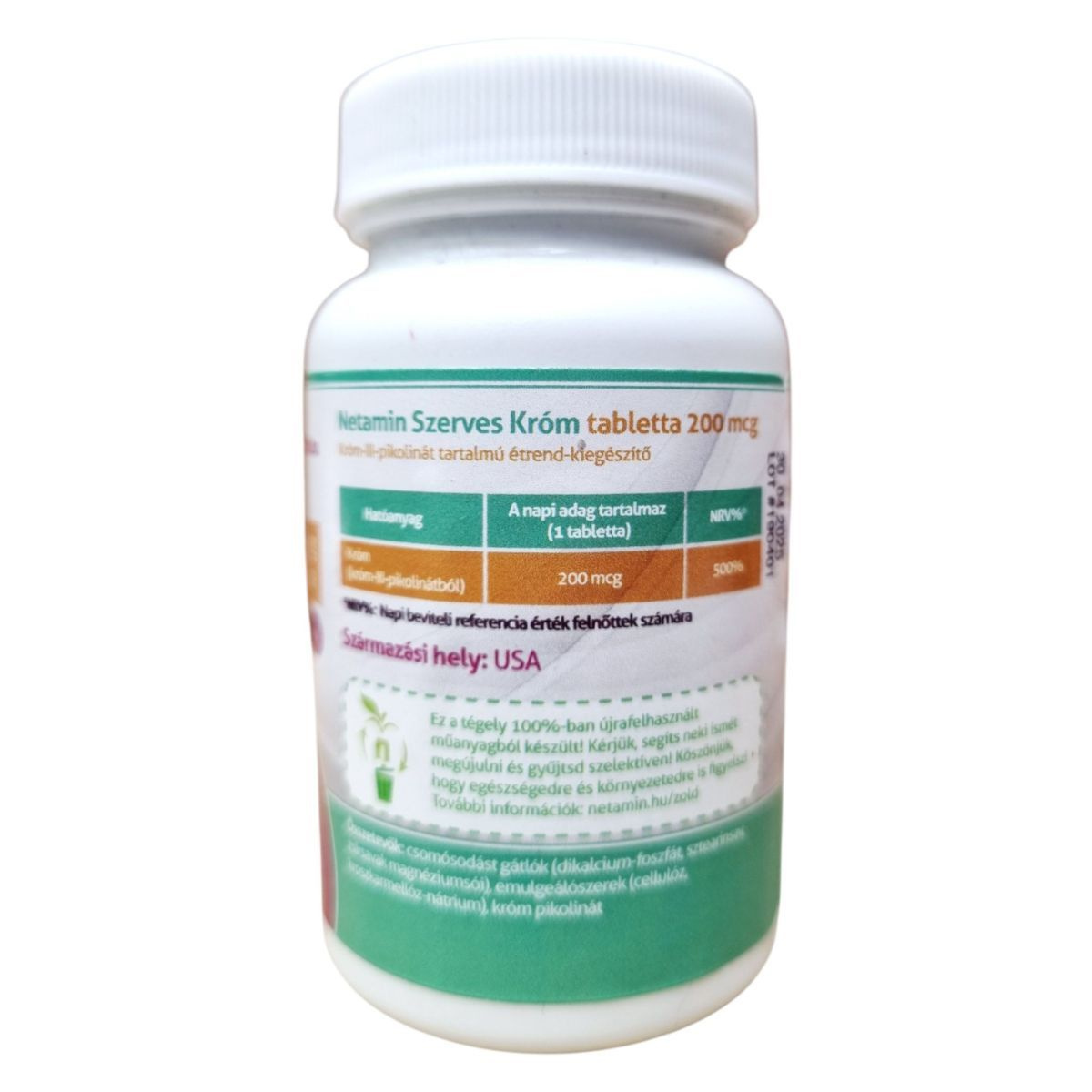 A Netamin Szerves Króm tabletta egy króm-III-pikolinát tartalmú étrend-kiegészítő, amely 200 mcg krómot tartalmaz tablettánként. A termék hozzájárulhat a normál vércukorszint fenntartásához és a makrotápanyagok normál anyagcseréjéhez. A tégely 100%-ban újrafelhasznált műanyagból készült, így környezetbarát választás lehet. A termék bio étrendi irányzatba illeszkedik, és a származási helye az USA. A Netamin Szerves Króm tabletta forgalmazója az Organikus Egészség Egyesület, amely Győrben található.