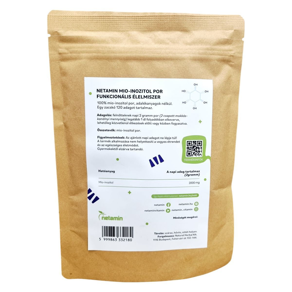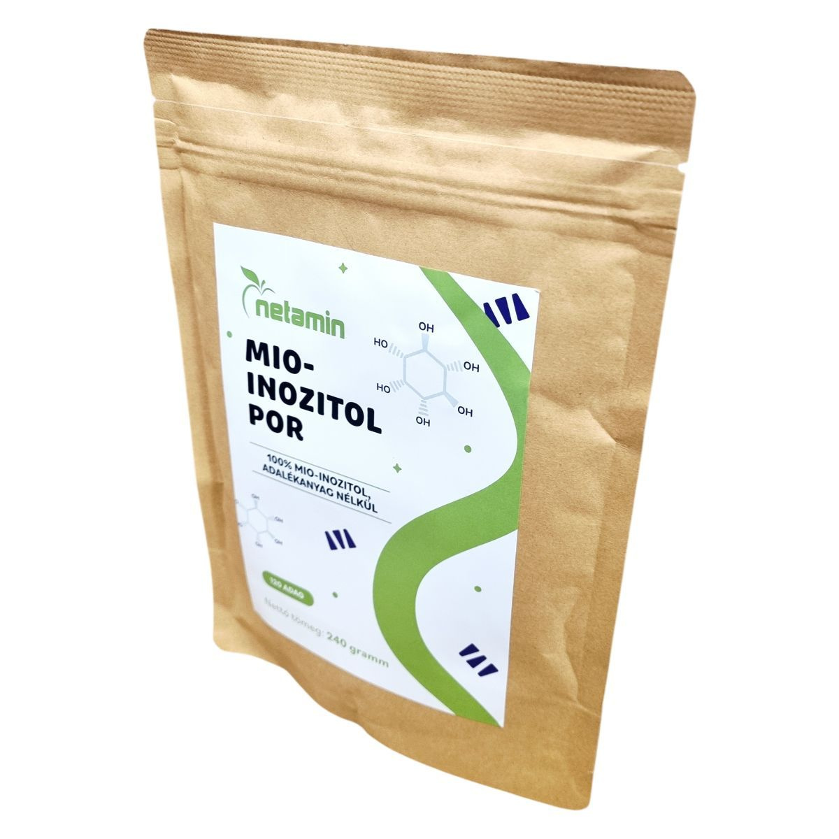 A Netamin Mio-inozitol por 100% mio-inozitolt tartalmaz, adalékanyagok nélkül. Egy csomag 120 adagot tartalmaz. A por folyadékban elkeverve fogyasztható, lehetőleg étkezések előtt vagy közben.