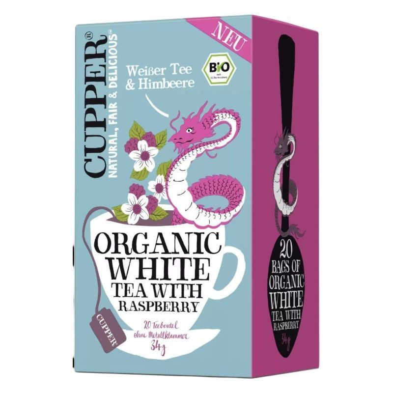 CUPPER Fehér tea & Málna bio tea - 20 db teafilter. Összetevők: fehér tea*, természetes málna ízesítés* (6%), málna darabok* (1%), természetes feketeribizli ízesítésl. *Összetevők: Ellenőrzött ökológiai gazdálkodásból.