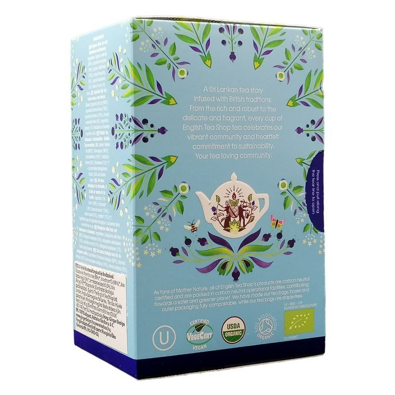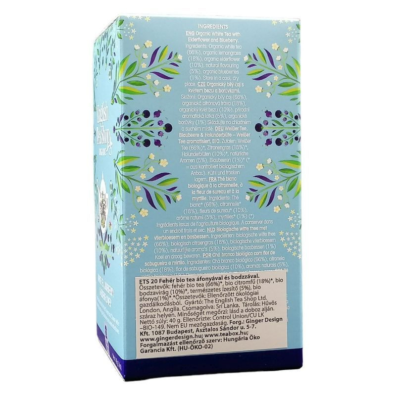 Összetevők: fehér tea*, citromfű*, bodza*, fekete áfonya*, természetes fekete áfonya ízesítéssel.