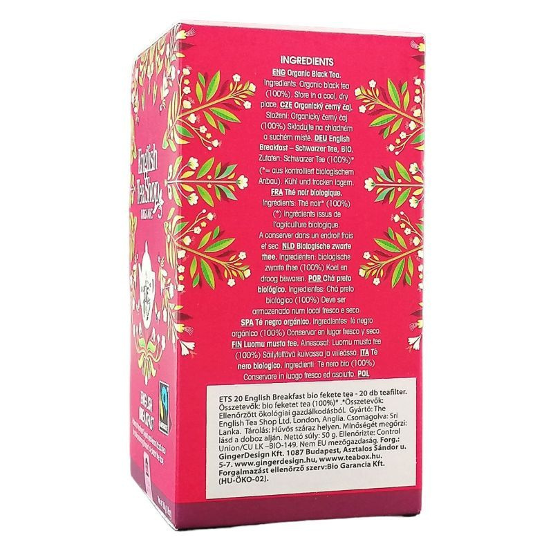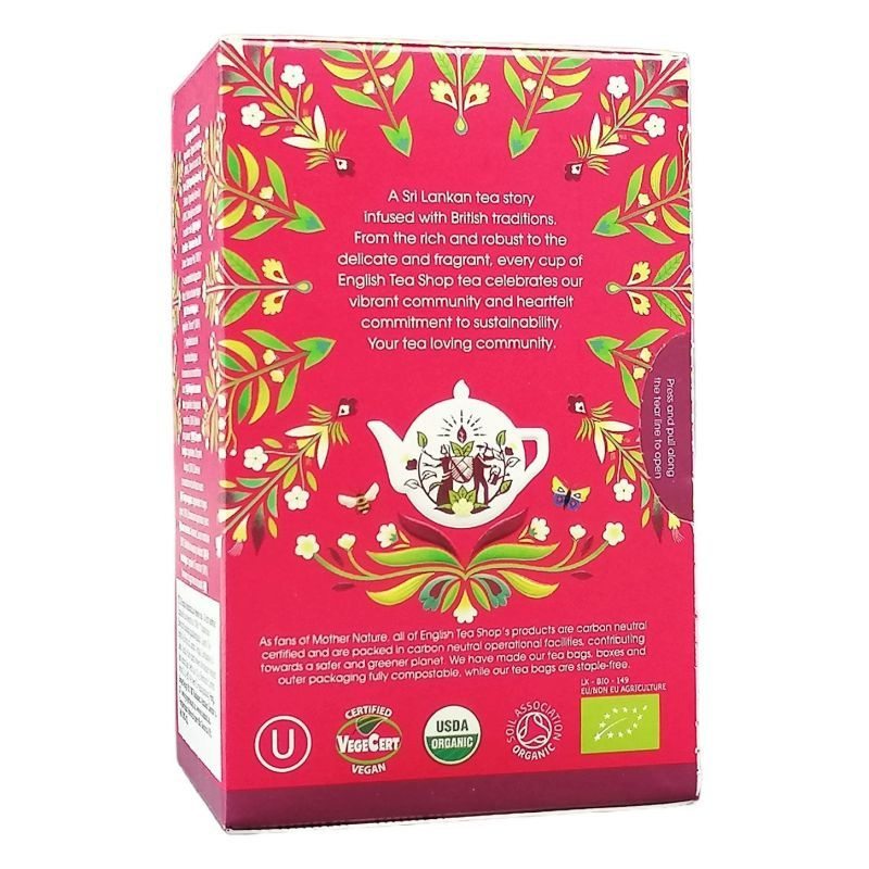 Összetevők: bio és Fairtrade Ceylon fekete tea*. *Összetevők: Ellenőrzött ökológiai gazdálkodásból. Gyártó: The English Tea Shop Ltd. London, Anglia. Csomagolva: Sri Lanka. Tárolás: Hűvös száraz helyen. Minőségét megőrzi: lásd a doboz alján.