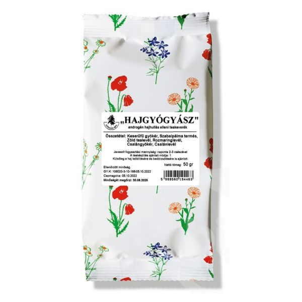Nőknek és férfiaknak ajánlott androgén hajhullás esetén. Belsoleg és a fejbőr kezelésére. Szabályozza a hajhullásért felelős hormontermelést és erosíti a hajhagymákat. Összetétel:Keserűfű gyökér, Szabalpálma termés, Zöld tealevél, Rozmaringlevél, Csalángyökér, Csalánlevél HASZNOS ISMERETEK A „HAJGYÓGYÁSZ” ANDROGÉN HAJHULLÁS ELLENI TEAKEVERÉKRŐL HOVÁ SOROLJUK? Androgén hajhullás (Alopecia androgenica) esetén, nőknek és férfiaknak egyaránt ajánlott teakeverék. Belsőleges fogyasztásra és fejbőr bedörzsölésére, leöblítésére. MIT TUDHATUNK A NÖVÉNYEKRŐL? A keserűfű gyökér, szabalpálma termés, zöld tea, rozmaringlevél, csalángyökér, csalánlevél a szakirodalom szerint egyaránt hatásosak az androgén hajhullás esetén. Szabályozzák a hajhullásért felelős hormontermelést és erősítik a hajhagymákat. Ezen felül gyulladásgátló és mikróba ellenes hatásuk is van. MILYEN ELŐNYÖS HATÁSSAL JÁR FOGYASZTÁSA SZERVEZETÜNKRE? Az androgén hajhullás oka a tesztoszteron hormonszint megemelkedése. Pontosabban a tesztoszteron hormonból az 5-alfa-reduktáz enzim hatására kialakuló dihidro-tesztoszteron. A kémiai folyamatok a kor előrehaladtával, a menopauzával és genetikai tényezőkkel is összefüggésben vannak. A legyengült állapotokat szintén kísérheti hajhullás. A felhasznált gyógynövények blokkolják a hajhullásért felelős enzimet és erősítik a szervezet ellenállóképességét. A csalán hajerősítő hatása régóta ismert, samponok alkotórésze. A teakeverék összetevőinek hatását a hagyományos felhasználás mellett laboratóriumi és humán klinikai kísérletek igazolják. HOGYAN ALKALMAZZUK? Hajöblítésre, bedörzsölésre is ajánlott! Autoimmun betegségben nem használható! A foltos hajhullás (Alopecia areata) kezelésére nem alkalmas! Adagolás: belsőleg fogyasztva 5 perc főzés és lehűlés után, étkezések között 3 csészével naponta. Legalább féléves kúra javasolt. Véralvadás gátló gyógyszerek (warfarin) szedése mellett a tea nem fogyasztható!